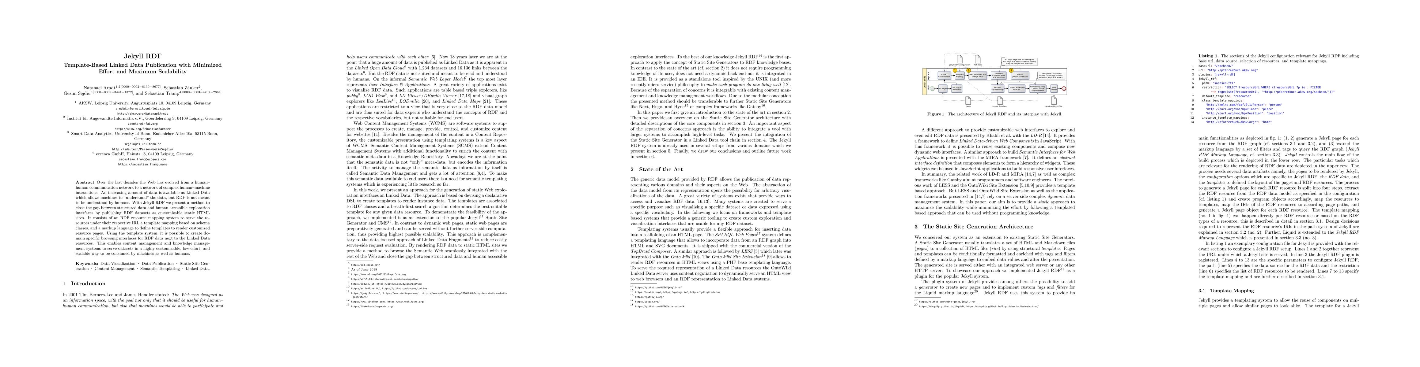 Jekyll RDF provides a method for publishing RDF datasets as customizable static HTML sites, bridging the gap between machine-readable Linked Data and human-accessible exploration interfaces. This approach enables scalable, low-effort, and domain-specific browsing interfaces for RDF data.