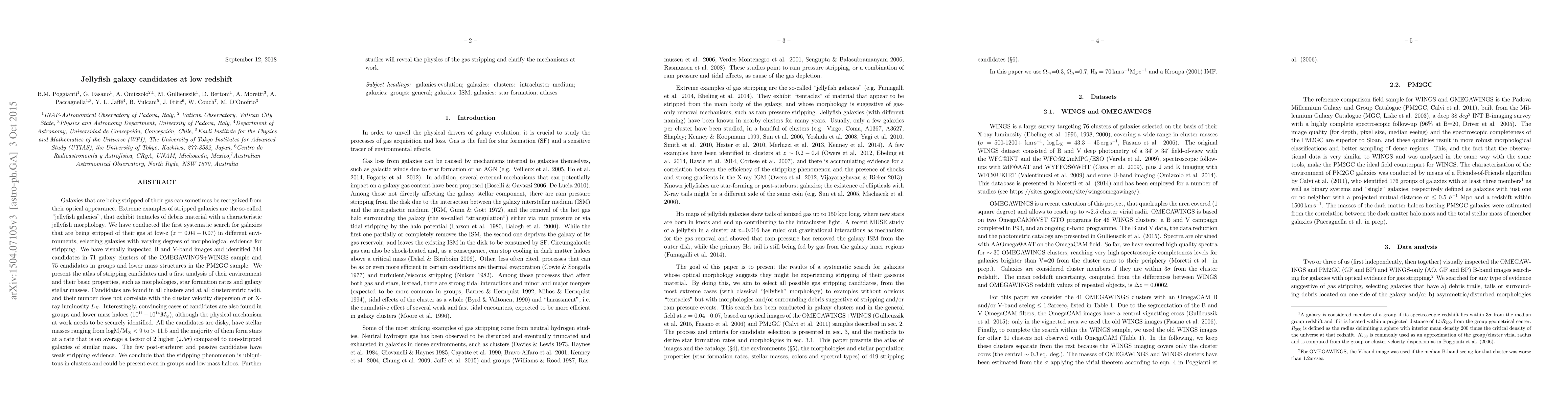 Researchers have identified 419 jellyfish galaxy candidates being stripped of gas at low redshifts in clusters and groups, with most having higher star formation rates than non-stripped galaxies.