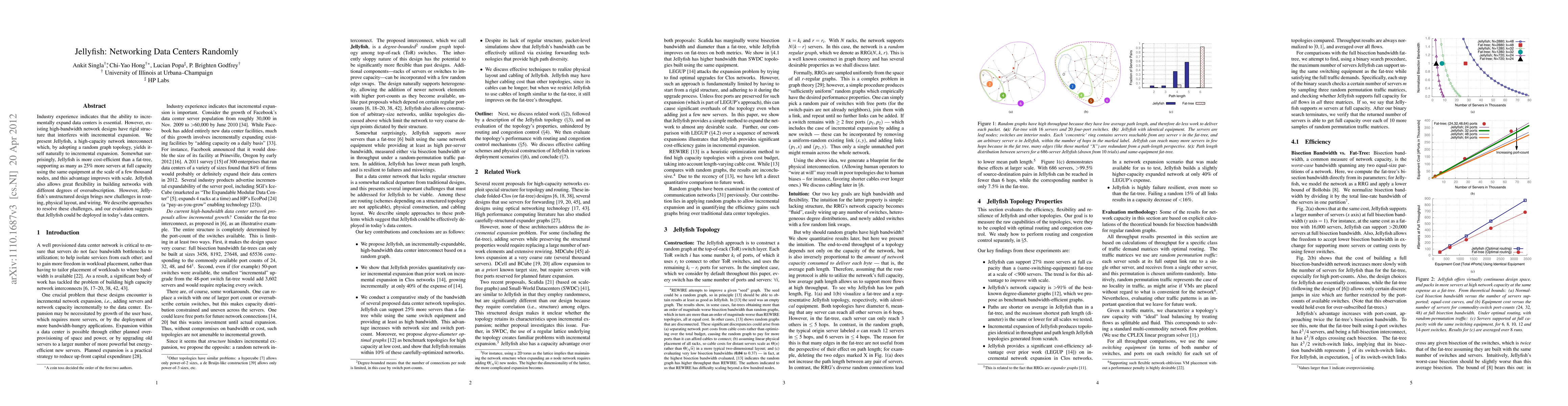 Jellyfish presents a novel random graph topology for high-capacity data center network interconnects, enabling incremental expansion and surpassing fat-tree designs in cost-efficiency and scalability. Despite its unstructured design, Jellyfish effectively addresses routing, layout, and wiring challenges, making it a viable option for modern data centers.