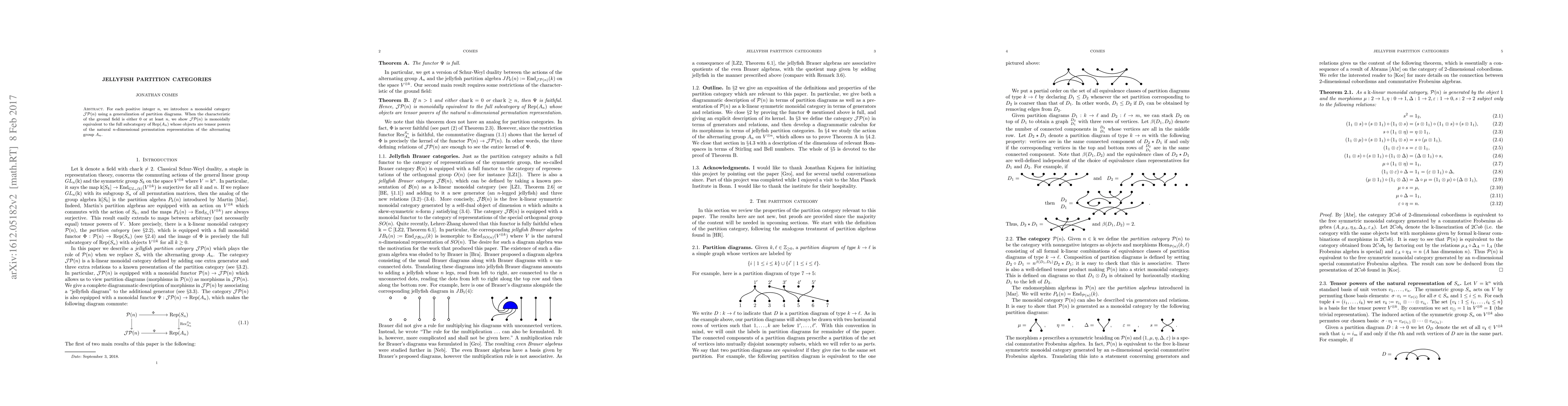 This research introduces monoidal categories $mathcal{JP}(n)$ for each positive integer $n$, utilizing partition diagram generalizations. The study demonstrates these categories' monoidal equivalence to a specific subcategory of $operatorname{Rep}(A_n)$, under certain field characteristic conditions, showcasing a connection between jellyfish category theory and representation theory of alternating groups.