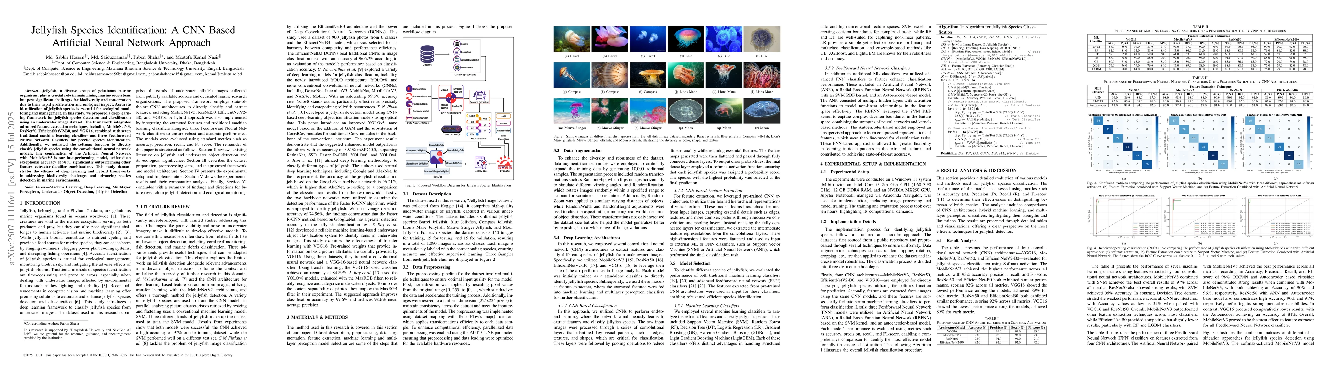 Jellyfish, a diverse group of gelatinous marine organisms, play a crucial role in maintaining marine ecosystems but pose significant challenges for biodiversity and conservation due to their rapid proliferation and ecological impact. Accurate identification of jellyfish species is essential for ecological monitoring and management. In this study, we proposed a deep learning framework for jellyfish species detection and classification using an underwater image dataset. The framework integrates advanced feature extraction techniques, including MobileNetV3, ResNet50, EfficientNetV2-B0, and VGG16, combined with seven traditional machine learning classifiers and three Feedforward Neural Network classifiers for precise species identification. Additionally, we activated the softmax function to directly classify jellyfish species using the convolutional neural network models. The combination of the Artificial Neural Network with MobileNetV3 is our best-performing model, achieving an exceptional accuracy of 98%, significantly outperforming other feature extractor-classifier combinations. This study demonstrates the efficacy of deep learning and hybrid frameworks in addressing biodiversity challenges and advancing species detection in marine environments.