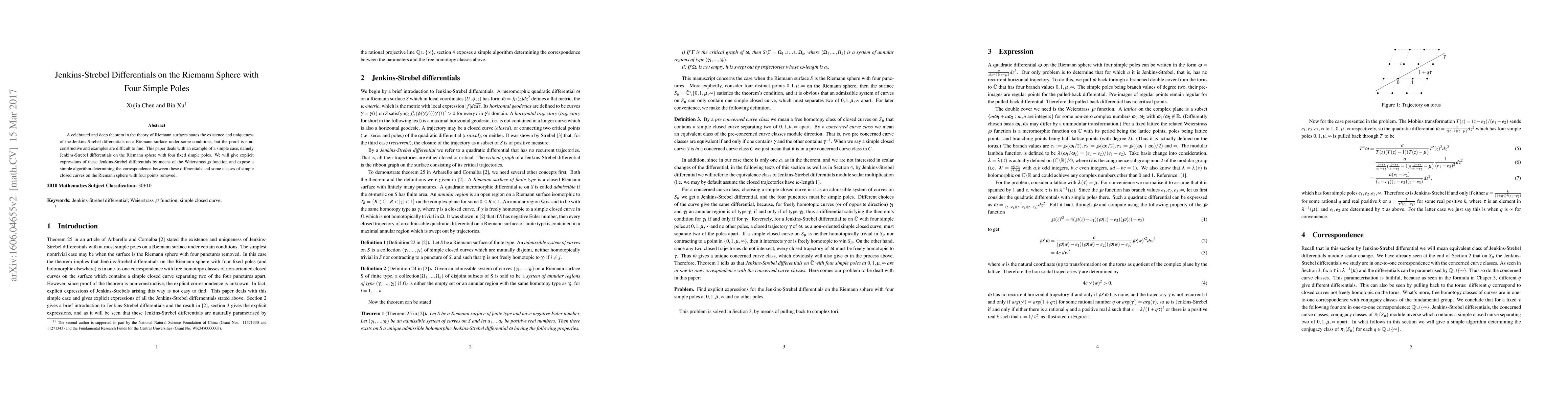 This paper provides explicit expressions for Jenkins-Strebel differentials on the Riemann sphere with four simple poles using the Weierstrass $\wp$ function, and outlines an algorithm to relate these differentials to specific simple closed curves on the modified sphere.