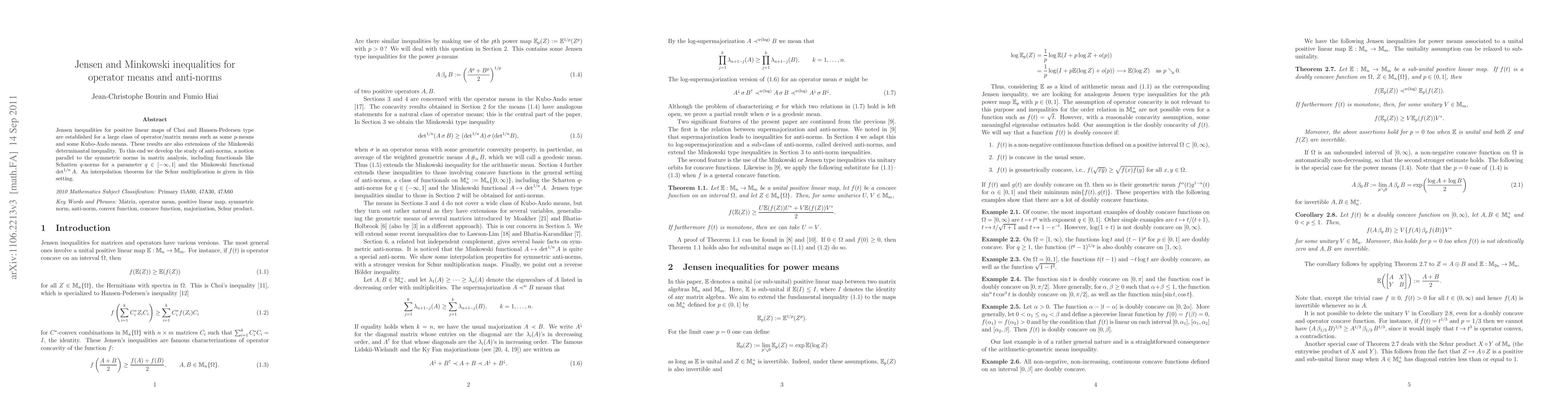 This paper establishes Jensen inequalities for a broad class of operator/matrix means, extending the Minkowski determinantal inequality. It introduces anti-norms, analogous to symmetric norms in matrix analysis, and includes results for Schatten q-norms and the Minkowski functional, alongside an interpolation theorem for Schur multiplication.