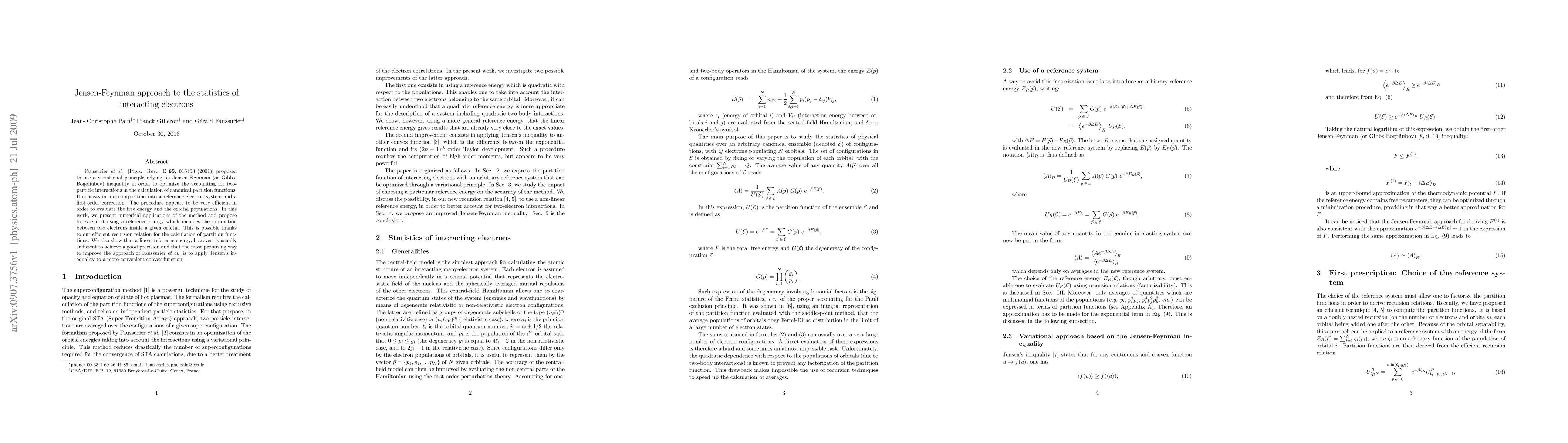 Faussurier et al. [Phys. Rev. E 65, 016403 (2001)] proposed to use a variational principle relying on Jensen-Feynman (or Gibbs-Bogoliubov) inequality in order to optimize the accounting for two-particle interactions in the calculation of canonical partition functions. It consists in a decomposition into a reference electron system and a first-order correction. The procedure appears to be very efficient in order to evaluate the free energy and the orbital populations. In this work, we present numerical applications of the method and propose to extend it using a reference energy which includes the interaction between two electrons inside a given orbital. This is possible thanks to our efficient recursion relation for the calculation of partition functions. We also show that a linear reference energy, however, is usually sufficient to achieve a good precision and that the most promising way to improve the approach of Faussurier et al. is to apply Jensen's inequality to a more convenient convex function.