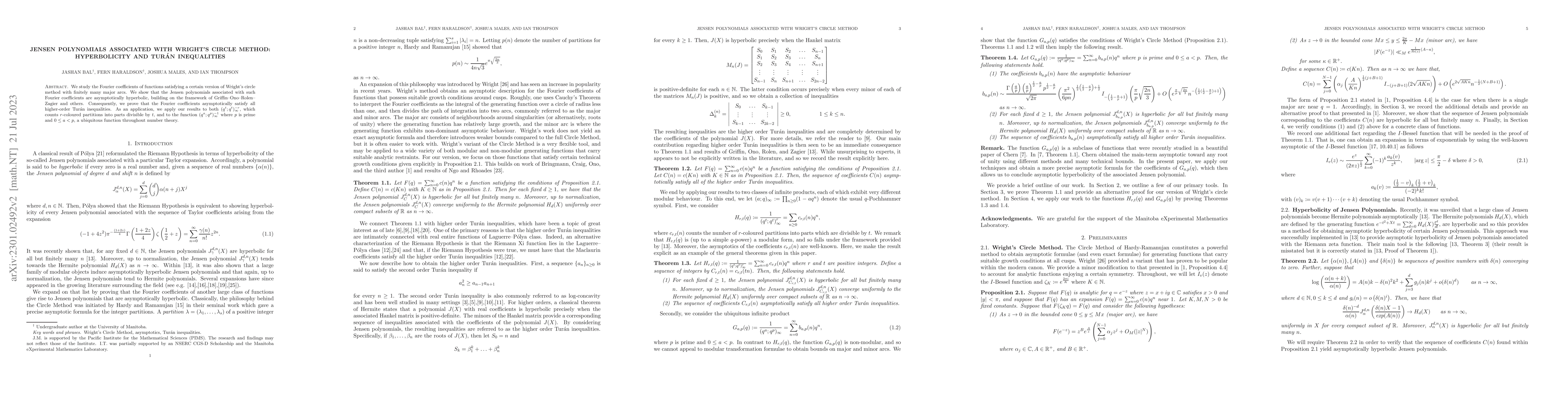 We study the Fourier coefficients of functions satisfying a certain version of Wright's circle method with finitely many major arcs. We show that the Jensen polynomials associated with such Fourier coefficients are asymptotically hyperbolic, building on the framework of Griffin--Ono--Rolen--Zagier and others. Consequently, we prove that the Fourier coefficients asymptotically satisfy all higher-order Tur\'an inequalities. As an application, we apply our results to both $(q^t;q^t)_\infty^{-r}$, which counts $r$-coloured partitions into parts divisible by $t$, and to the function $(q^{a};q^{p})_\infty^{-1}$ where $p$ is prime and $0\leq a