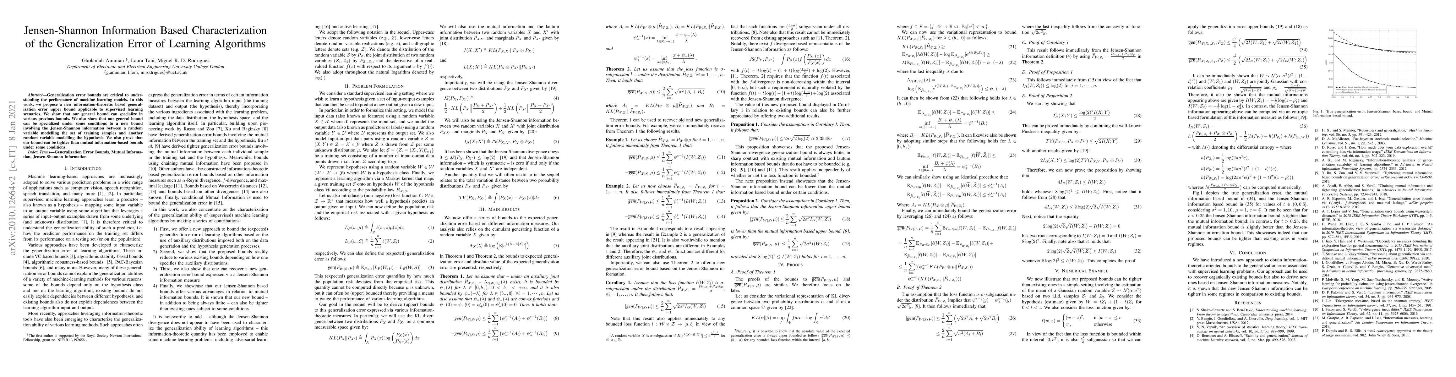 This paper proposes a new information-theoretic generalization error bound for supervised learning, showing it can specialize into various previous bounds and a new bound involving Jensen-Shannon information. The authors prove that their new bound can be tighter than mutual information-based bounds under certain conditions.