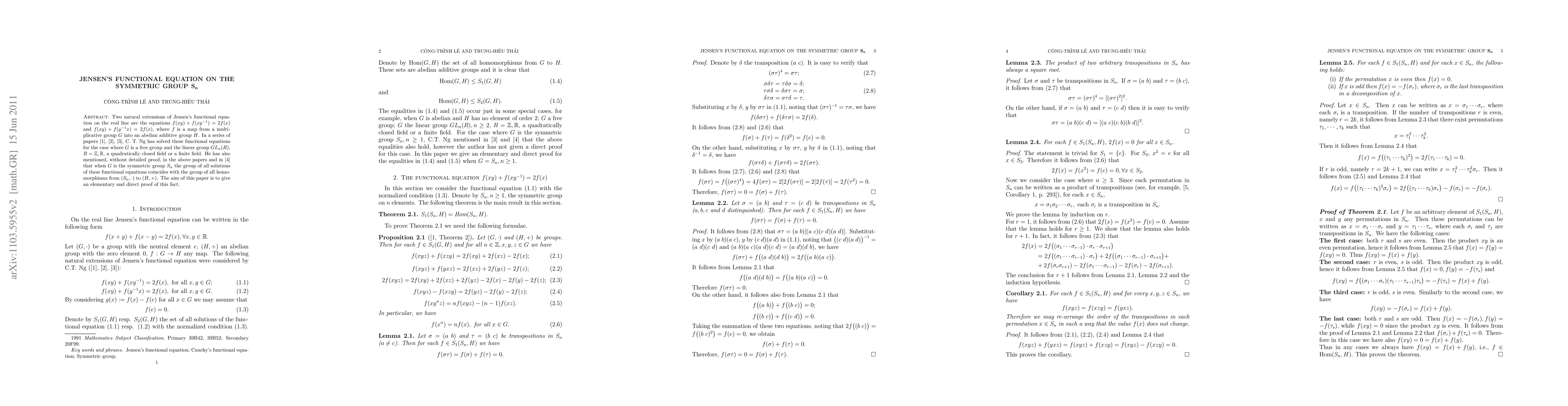 Two natural extensions of Jensen's functional equation on the real line are the equations $f(xy)+f(xy^{-1}) = 2f(x)$ and $f(xy)+f(y^{-1}x) = 2f(x)$, where $f$ is a map from a multiplicative group $G$ into an abelian additive group $H$. In a series of papers \cite{Ng1}, \cite{Ng2}, \cite{Ng3}, C. T. Ng has solved these functional equations for the case where $G$ is a free group and the linear group $GL_n(R)$, $R=\z,\r$, a quadratically closed field or a finite field. He has also mentioned, without detailed proof, in the above papers and in \cite{Ng4} that when $G$ is the symmetric group $S_n$ the group of all solutions of these functional equations coincides with the group of all homomorphisms from $(S_n,\cdot)$ to $(H,+)$. The aim of this paper is to give an elementary and direct proof of this fact.