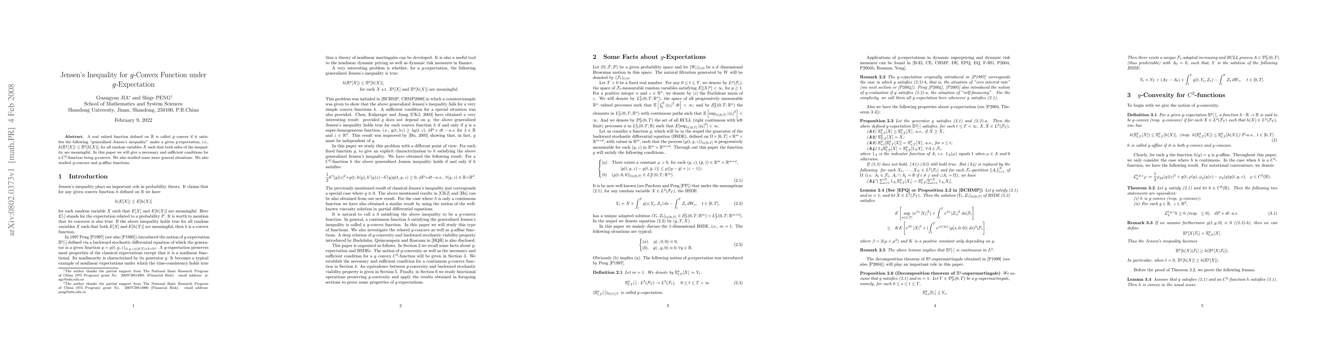 A real valued function defined on}$\mathbb{R}$ {\small is called}$g${\small --convex if it satisfies the following \textquotedblleft generalized Jensen's inequality\textquotedblright under a given}$g${\small -expectation, i.e., }$h(\mathbb{E}^{g}[X])\leq \mathbb{E}% ^{g}[h(X)]${\small, for all random variables}$X$ {\small such that both sides of the inequality are meaningful. In this paper we will give a necessary and sufficient conditions for a }$C^{2}${\small -function being}$% g ${\small -convex. We also studied some more general situations. We also studied}$g${\small -concave and}$g${\small -affine functions.