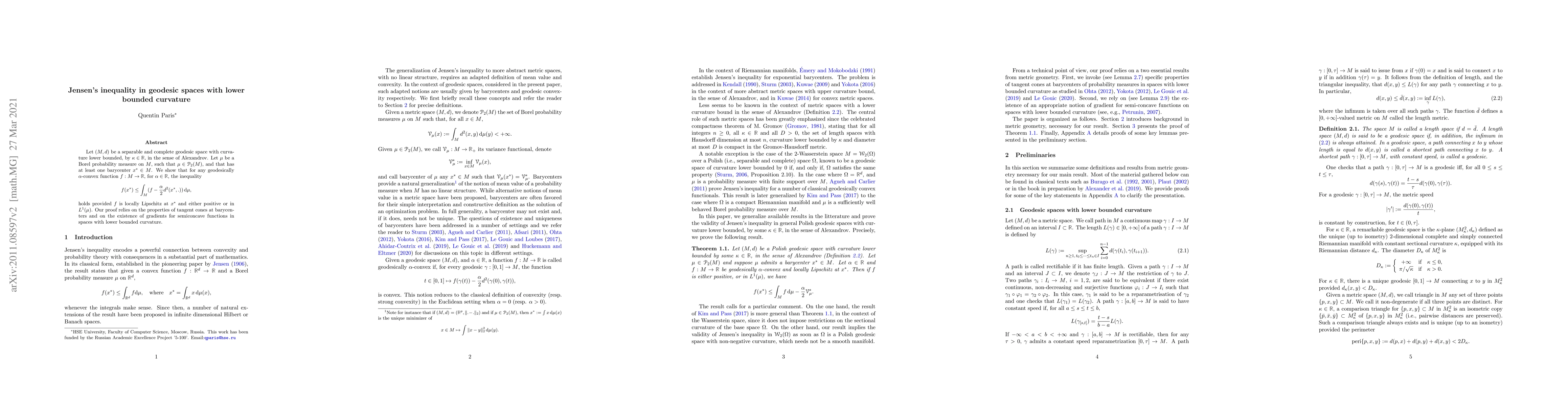 Let $(M,d)$ be a separable and complete geodesic space with curvature lower bounded, by $\kappa\in \mathbb R$, in the sense of Alexandrov. Let $\mu$ be a Borel probability measure on $M$, such that $\mu\in\mathcal P_2(M)$, and that has at least one barycenter $x^{*}\in M$. We show that for any geodesically $\alpha$-convex function $f:M\to \mathbb R$, for $\alpha\in \mathbb R$, the inequality \[f(x^*)\le \int_M (f -\frac{\alpha}{2}d^2(x^*,.))\,{\rm d}\mu,\] holds provided $f$ is locally Lipschitz at $x^*$ and either positive or in $L^1(\mu)$. Our proof relies on the properties of tangent cones at barycenters and on the existence of gradients for semi-concave functions in spaces with lower bounded curvature.