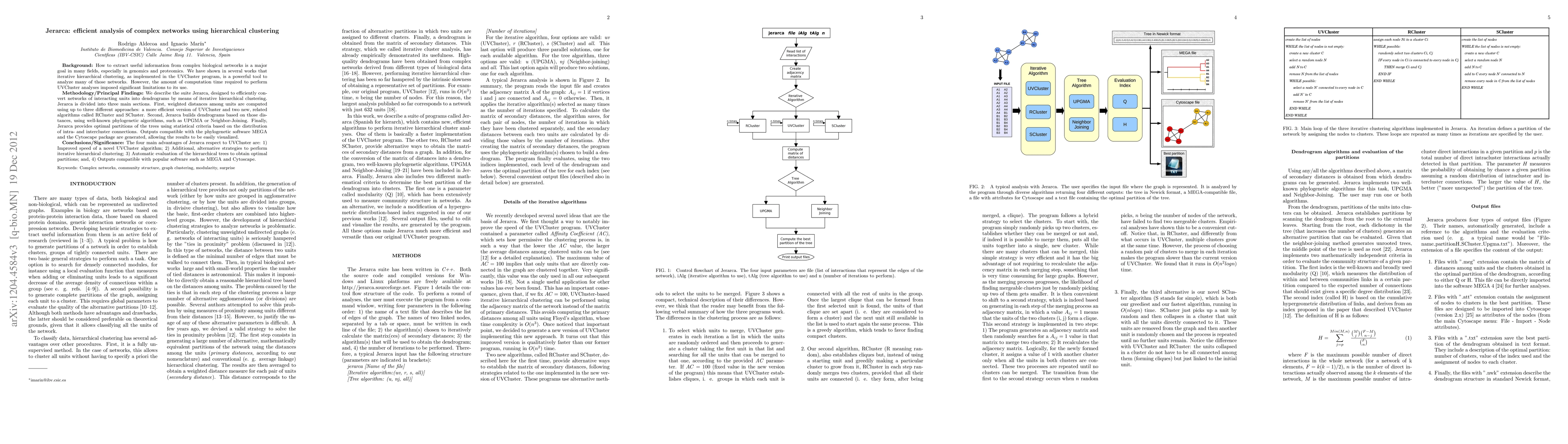 Jerarca is a suite for efficient hierarchical clustering of complex networks, offering faster computation, alternative clustering algorithms, and automatic tree partitioning, while generating outputs compatible with popular software for visualization. It aims to overcome the computational limitations of its predecessor, UVCluster, in analyzing biological networks.