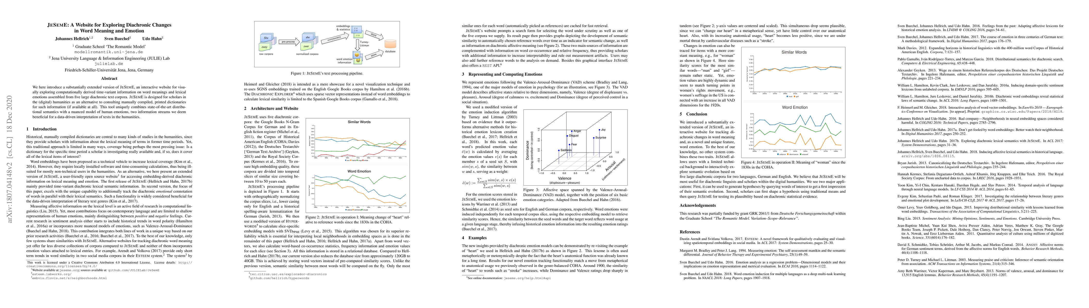 JeSemE is a digital tool for exploring word meanings and emotions over time, combining distributional semantics with emotional intelligence for humanities scholars.