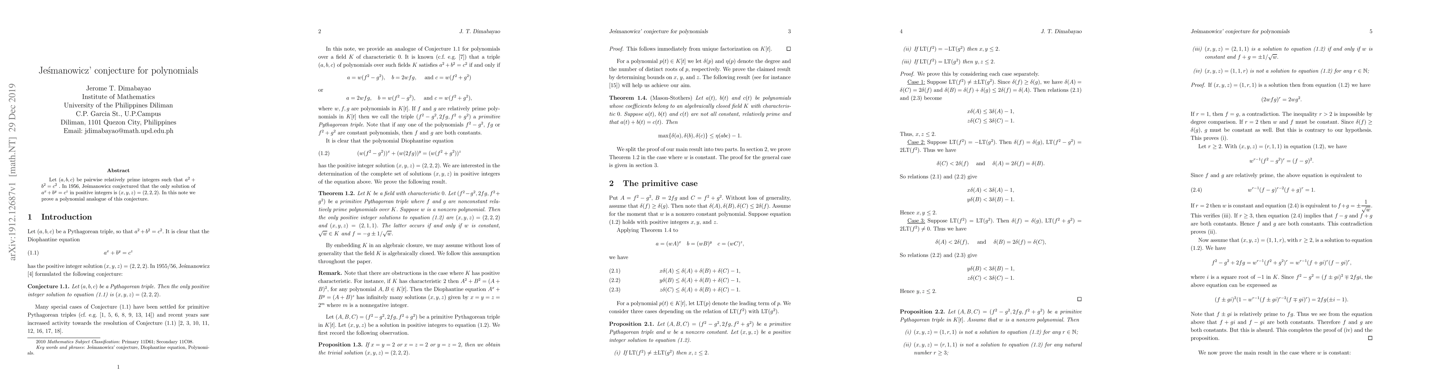The paper proves a polynomial analogue of Jęsmanowicz's conjecture, showing that the only solution in positive integers for $a^x + b^y = c^z$ is $(x,y,z)=(2,2,2)$, where $a$, $b$, and $c$ are pairwise relatively prime integers satisfying $a^2 + b^2 = c^2$.