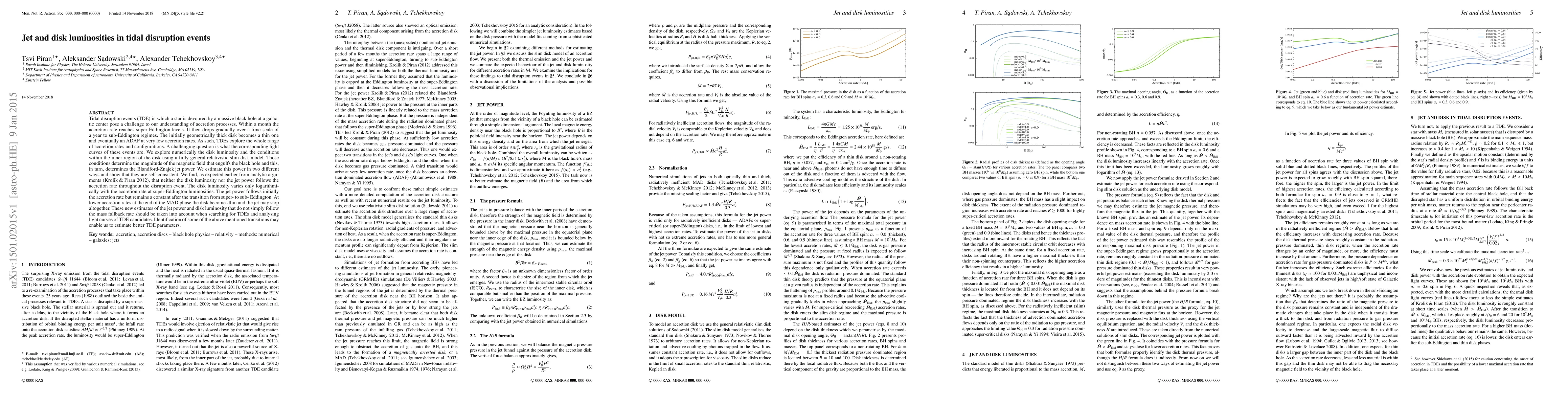 Tidal disruption events (TDE) in which a star is devoured by a massive black hole at a galac- tic center pose a challenge to our understanding of accretion processes. Within a month the accretion rate reaches super-Eddington levels. It then drops gradually over a time scale of a year to sub-Eddington regimes. The initially geometrically thick disk becomes a thin one and eventually an ADAF at very low accretion rates. As such, TDEs explore the whole range of accretion rates and configurations. A challenging question is what the corresponding light curves of these events are. We explore numerically the disk luminosity and the conditions within the inner region of the disk using a fully general relativistic slim disk model. Those conditions determine the magnitude of the magnetic field that engulfs the black hole and this, in turn, determines the Blandford-Znajek jet power. We estimate this power in two different ways and show that they are self-consistent. We find, as expected earlier from analytic argu- ments (Krolik & Piran 2012), that neither the disk luminosity nor the jet power follows the accretion rate throughout the disruption event. The disk luminosity varies only logarithmi- cally with the accretion rate at super-Eddington luminosities. The jet power follows initially the accretion rate but remains a constant after the transition from super- to sub- Eddington. At lower accretion rates at the end of the MAD phase the disk becomes thin and the jet may stop altogether. These new estimates of the jet power and disk luminosity that do not simply follow the mass fallback rate should be taken into account when searching for TDEs and analysing light curves of TDE candidates. Identification of some of the above mentioned transitions may enable us to estimate better TDE parameters.