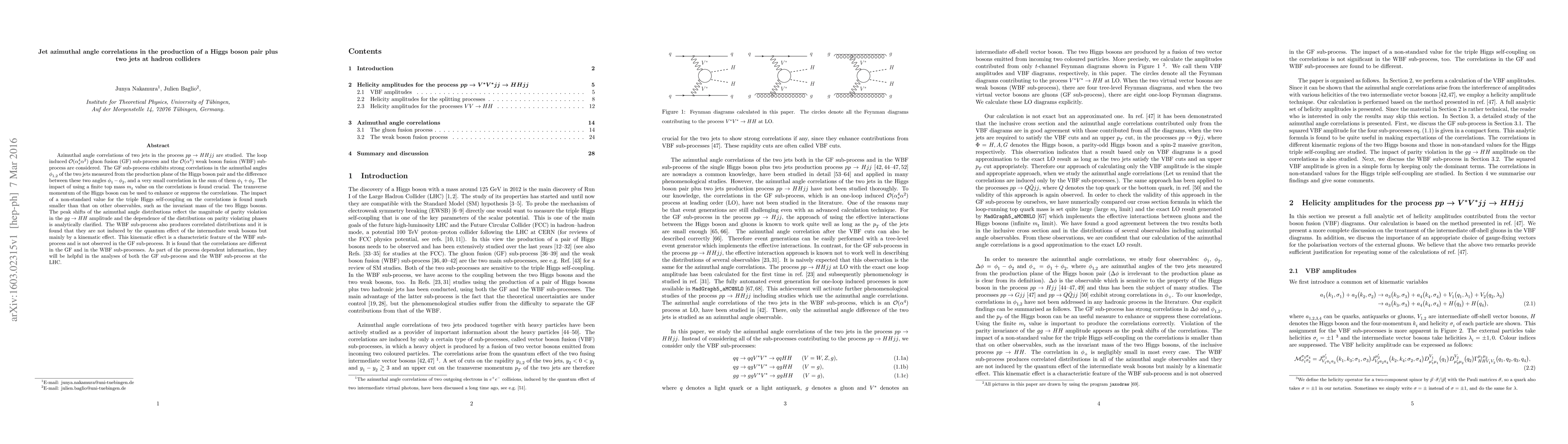 Azimuthal angle correlations of two jets in the process $pp\to HHjj$ are studied. The loop induced $\mathcal{O}(\alpha_s^4 \alpha_{}^2)$ gluon fusion (GF) sub-process and the $\mathcal{O}(\alpha_{}^4)$ weak boson fusion (WBF) sub-process are considered. The GF sub-process exhibits strong correlations in the azimuthal angles $\phi_{1,2}^{}$ of the two jets measured from the production plane of the Higgs boson pair and the difference between these two angles $\phi_1^{}-\phi_2^{}$, and a very small correlation in the sum of them $\phi_1^{}+\phi_2^{}$. The impact of using a finite top mass $m_t^{}$ value on the correlations is found crucial. The transverse momentum of the Higgs boson can be used to enhance or suppress the correlations. The impact of a non-standard value for the triple Higgs self-coupling on the correlations is found much smaller than that on other observables, such as the invariant mass of the two Higgs bosons. The peak shifts of the azimuthal angle distributions reflect the magnitude of parity violation in the $gg\to HH$ amplitude and the dependence of the distributions on parity violating phases is analytically clarified. The WBF sub-process also produces correlated distributions and it is found that they are not induced by the quantum effect of the intermediate weak bosons but mainly by a kinematic effect. This kinematic effect is a characteristic feature of the WBF sub-process and is not observed in the GF sub-process. It is found that the correlations are different in the GF and in the WBF sub-processes. As part of the process dependent information, they will be helpful in the analyses of both the GF sub-process and the WBF sub-process at the LHC.