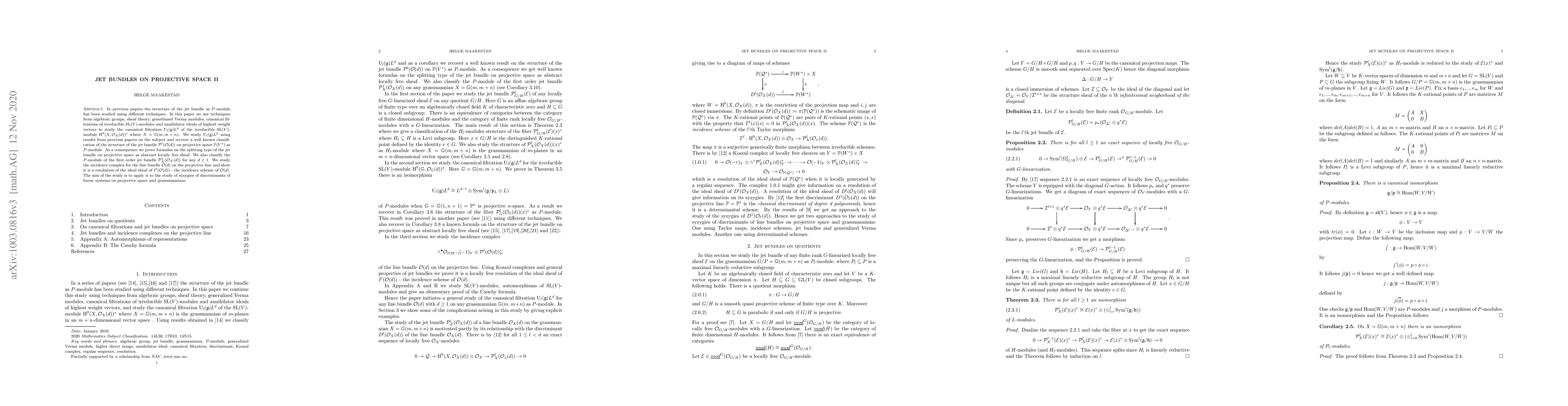 Let G=SL(E) be the special linear algebraic group on E where E is a finite dimensional vector space over a field K of characteristic zero. In this paper we study the canonical filtration of the dual G-module of global sections of a G-linearized invertible sheaf L on the grassmannian G/P where P in G is the parabolic subgroup stabilizing a subspace W in E. We classify the canonical filtration as P-module and as a consequence we recover known formulas on the P-module structure of the jet bundle J(L) on projective space. We study the incidence complex for the invertible sheaf O(d) on the projective line and prove it gives a resolution of the incidence scheme I(O(d)) of O(d). The aim of this study is to apply it to the study of resolutions of ideal sheaves of discriminants of invertible sheaves on grassmannians and flag varieties. We also give an elementary proof of the Cauchy formula. Hence the paper introduce the canonical filtration of an arbitrary irreducible SL(E)-module and initiates a study of the canonical filtration as P-module where P in SL(E) is a parabolic subgroup.