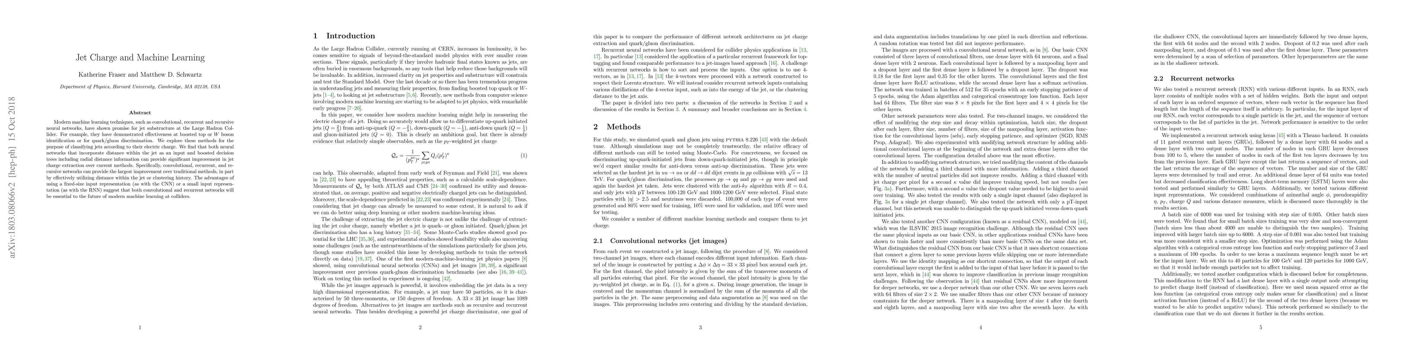 Modern machine learning techniques, such as convolutional, recurrent and recursive neural networks, have shown promise for jet substructure at the Large Hadron Collider. For example, they have demonstrated effectiveness at boosted top or W boson identification or for quark/gluon discrimination. We explore these methods for the purpose of classifying jets according to their electric charge. We find that both neural networks that incorporate distance within the jet as an input and boosted decision trees including radial distance information can provide significant improvement in jet charge extraction over current methods. Specifically, convolutional, recurrent, and recursive networks can provide the largest improvement over traditional methods, in part by effectively utilizing distance within the jet or clustering history. The advantages of using a fixed-size input representation (as with the CNN) or a small input representation (as with the RNN) suggest that both convolutional and recurrent networks will be essential to the future of modern machine learning at colliders.