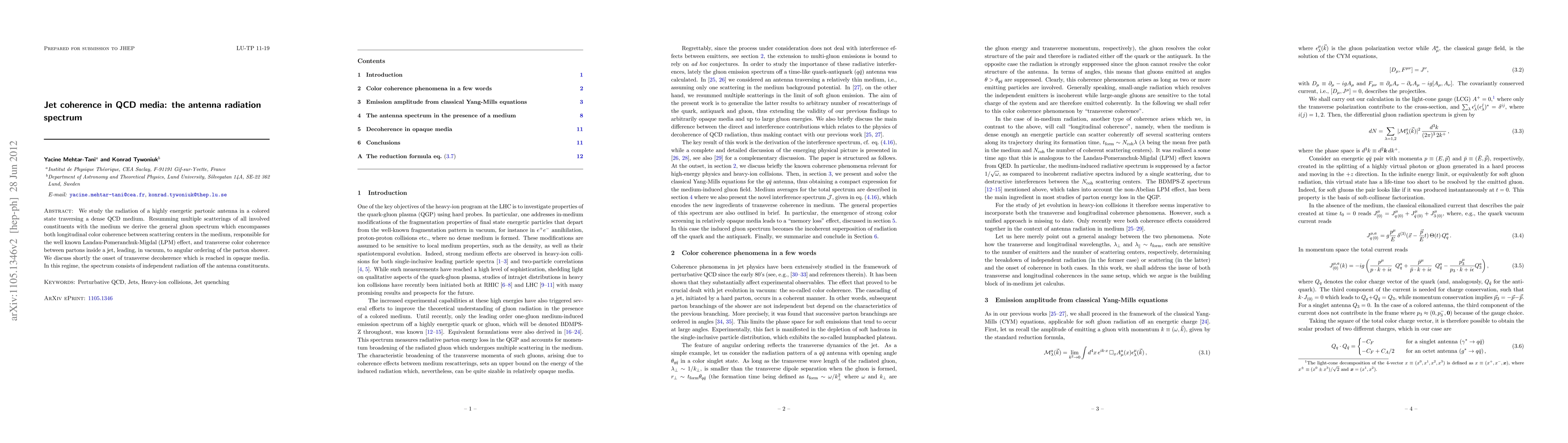We study the radiation of a highly energetic partonic antenna in a colored state traversing a dense QCD medium. Resumming multiple scatterings of all involved constituents with the medium we derive the general gluon spectrum which encompasses both longitudinal color coherence between scattering centers in the medium, responsible for the well known Landau-Pomeranchuk-Migdal (LPM) effect, and transverse color coherence between partons inside a jet, leading, in vacuum, to angular ordering of the parton shower. We discuss shortly the onset of transverse decoherence which is reached in opaque media. In this regime, the spectrum consists of independent radiation off the antenna constituents.
