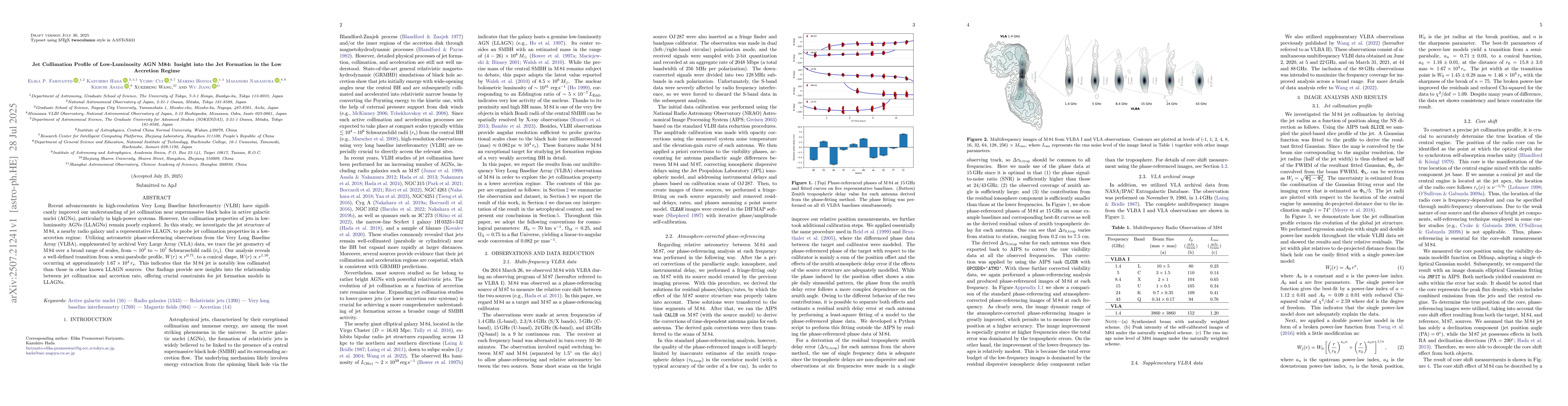 Recent advancements in high-resolution Very Long Baseline Interferometry (VLBI) have significantly improved our understanding of jet collimation near supermassive black holes in active galactic nuclei (AGNs), particularly in high-power systems. However, the collimation properties of jets in low-luminosity AGNs (LLAGNs) remain poorly explored. In this study, we investigate the jet structure of M84, a nearby radio galaxy and a representative LLAGN, to probe jet collimation properties in a low-accretion regime. Utilizing astrometric phase-referencing observations from the Very Long Baseline Array (VLBA), supplemented by archival Very Large Array (VLA) data, we trace the jet geometry of M84 over a broad range of scales, from approximately 10^2 to 10^7 Schwarzschild radii (rs). Our analysis reveals a well-defined transition from a semi-parabolic profile, W(r) proportional to r^0.71, to a conical shape, W(r) proportional to r^1.16, occurring at approximately 1.67 x 10^4 rs. This indicates that the M84 jet is notably less collimated than those in other known LLAGN sources. Our findings provide new insights into the relationship between jet collimation and accretion rate, offering crucial constraints for jet formation models in LLAGNs.