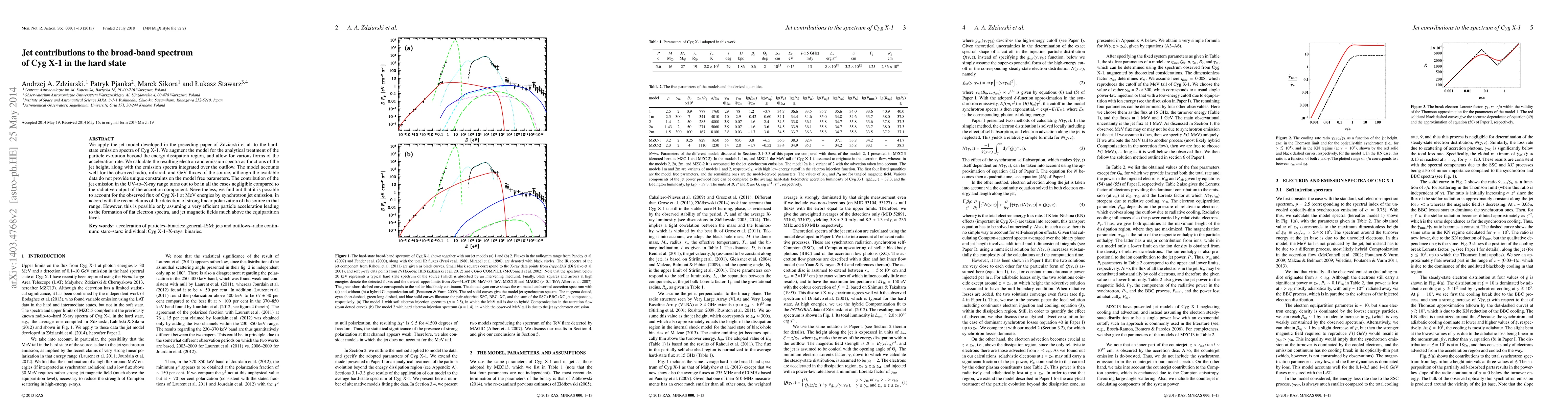 We apply the jet model developed in the preceding paper of Zdziarski et al. to the hard-state emission spectra of Cyg X-1. We augment the model for the analytical treatment of the particle evolution beyond the energy dissipation region, and allow for various forms of the acceleration rate. We calculate the resulting electron and emission spectra as functions of the jet height, along with the emission spectra integrated over the outflow. The model accounts well for the observed radio, infrared, and GeV fluxes of the source, although the available data do not provide unique constraints on the model free parameters. The contribution of the jet emission in the UV--to--X-ray range turns out to be in all the cases negligible compared to the radiative output of the accretion component. Nevertheless, we find out that it is possible to account for the observed flux of Cyg X-1 at MeV energies by synchrotron jet emission, in accord with the recent claims of the detection of strong linear polarization of the source in that range. However, this is possible only assuming a very efficient particle acceleration leading to the formation of flat electron spectra, and jet magnetic fields much above the equipartition level.