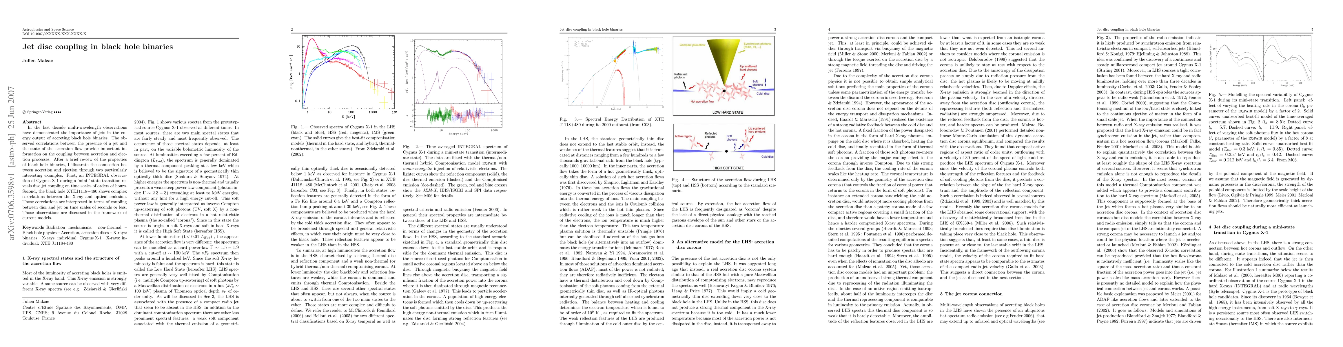 This paper reviews the coupling between accretion and ejection processes in black hole binaries, highlighting observations of Cygnus X-1 and XTEJ1118+480 that reveal disc-jet interactions on different time scales, providing insights into the mechanisms driving jet formation.