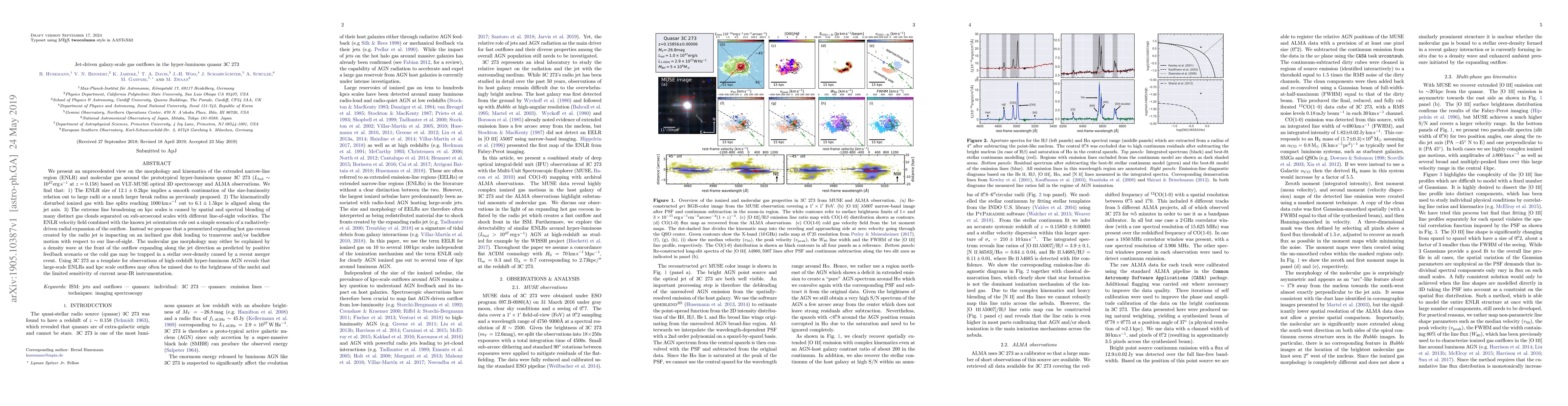 This study, using VLT-MUSE and ALMA observations, reveals that the extended narrow-line region (ENLR) and molecular gas in quasar 3C273 are kinematically disturbed and aligned with the jet axis. The research suggests a pressurized hot gas cocoon from the radio jet impacting an inclined gas disk, causing transverse and backflow motions, rather than simple radial expansion. The findings indicate that large-scale ENLRs and kpc scale outflows might be overlooked in high-redshift hyper-luminous AGN due to nuclear brightness and instrumentation limitations.