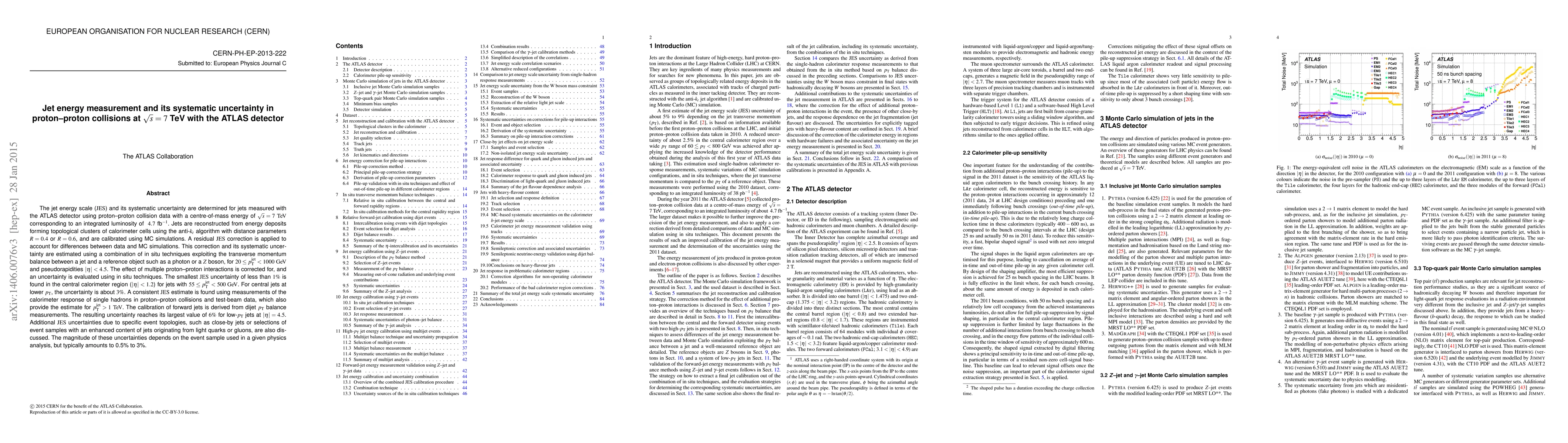 The jet energy scale (JES) and its systematic uncertainty are determined for jets measured with the ATLAS detector using proton-proton collision data with a centre-of-mass energy of $\sqrt{s}=7$ TeV corresponding to an integrated luminosity of 4.7 fb$^{-1}$. Jets are reconstructed from energy deposits forming topological clusters of calorimeter cells using the anti-k$_t$ algorithm with distance parameters $R=0.4$ or $R=0.6$, and are calibrated using MC simulations. A residual JES correction is applied to account for differences between data and MC simulations. This correction and its systematic uncertainty are estimated using a combination of in situ techniques exploiting the transverse momentum balance between a jet and a reference object such as a photon or a Z boson, for $20 < p_T < 1000$ GeV and pseudorapidities $|\eta|<4.5$. The effect of multiple proton-proton interactions is corrected for, and an uncertainty is evaluatedusing in situ techniques. The smallest JES uncertainty of less than $1 %$ is found in the central calorimeter region($|\eta|<1.2$) for jets with $55< p_T< 500$ GeV. For central jets at lower $p_T$, the uncertainty is about $3 %$. A consistent JES estimate is found using measurements of the calorimeter response of single hadrons in proton-proton collisionsand test-beam data, which also provide the estimate for $p_{T,jet} > 1$ TeV. The calibration of forward jets is derived from dijet $p_T$ balance measurements. The resulting uncertainty reaches its largest value of $6%$ for low-$p_T$ jets at $|\eta|=4.5$. Additional JES uncertainties due to specific event topologies, such as close-by jets or selections of event samples with an enhanced content of jets originating from light quarks or gluons, are also discussed. The magnitude of these uncertainties depends on the event sample used in a given physics analysis, but typically amounts to $0.5%$ to $3%$.