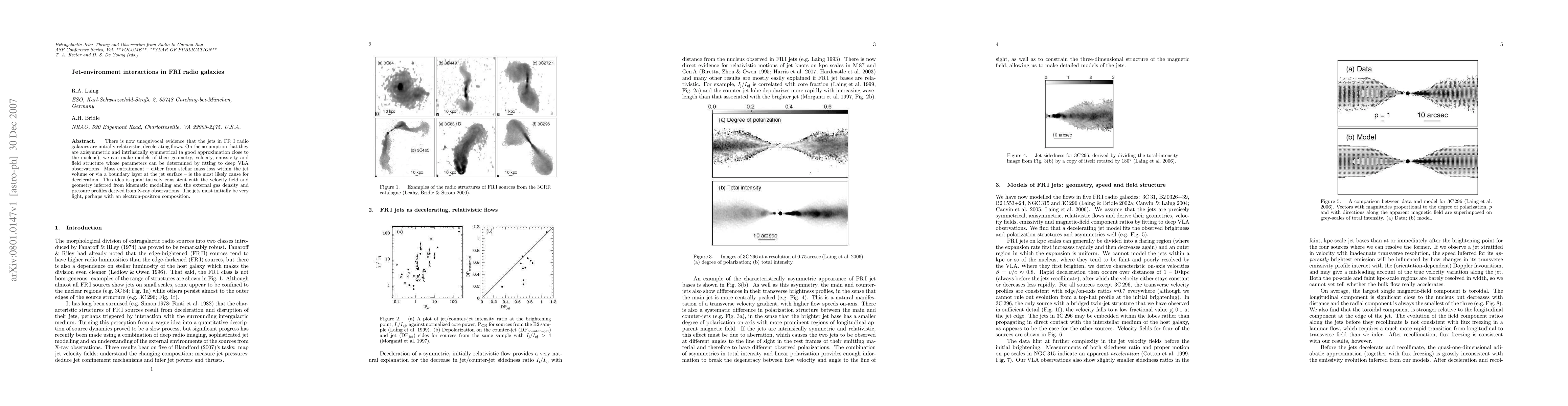 There is now unequivocal evidence that the jets in FR I radio galaxies are initially relativistic, decelerating flows. On the assumption that they are axisymmetric and intrinsically symmetrical (a good approximation close to the nucleus), we can make models of their geometry, velocity, emissivity and field structure whose parameters can be determined by fitting to deep VLA observations. Mass entrainment - either from stellar mass loss within the jet volume or via a boundary layer at the jet surface - is the most likely cause for deceleration. This idea is quantitatively consistent with the velocity field and geometry inferred from kinematic modelling and the external gas density and pressure profiles derived from X-ray observations. The jets must initially be very light, perhaps with an electron-positron composition.