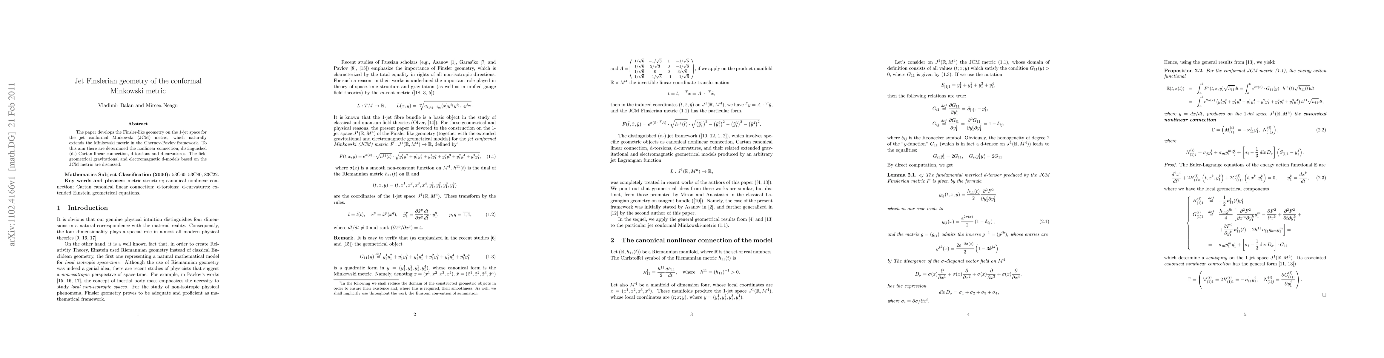 The paper explores the Finsler-like geometry on the 1-jet space for the jet conformal Minkowski metric, determining its nonlinear connection, Cartan linear connection, and associated torsions and curvatures. It also discusses field geometrical models for gravity and electromagnetism based on this metric.