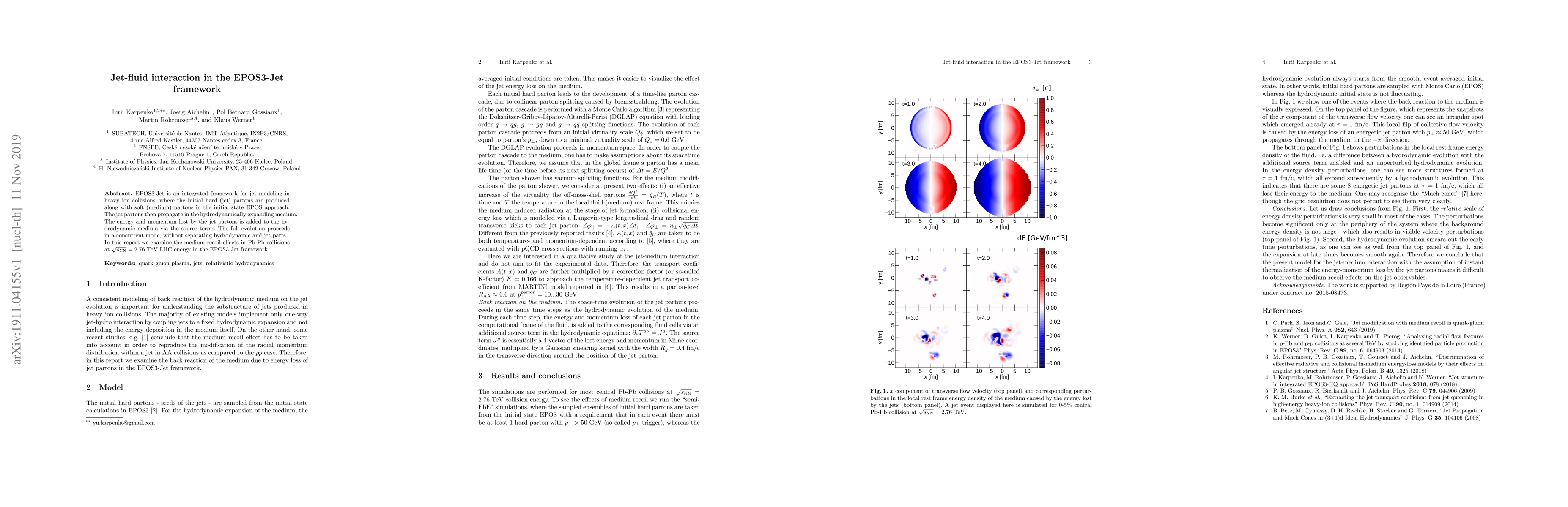 EPOS3-Jet is an integrated framework for jet modelling in heavy ion collisions, where the initial hard (jet) partons are produced along with soft (medium) partons in the initial state EPOS approach. The jet partons then propagate in the hydrodynamically expanding medium. The energy and momentum lost by the jet partons is added to the hydrodynamic medium via the source terms. The full evolution proceeds in a concurrent mode, without separating hydrodynamic and jet parts. In this report, we examine the medium recoil effects in Pb-Pb collisions at $\sqrt{s_{\rm NN}}=2.76$ TeV LHC energy in the EPOS3-Jet framework.