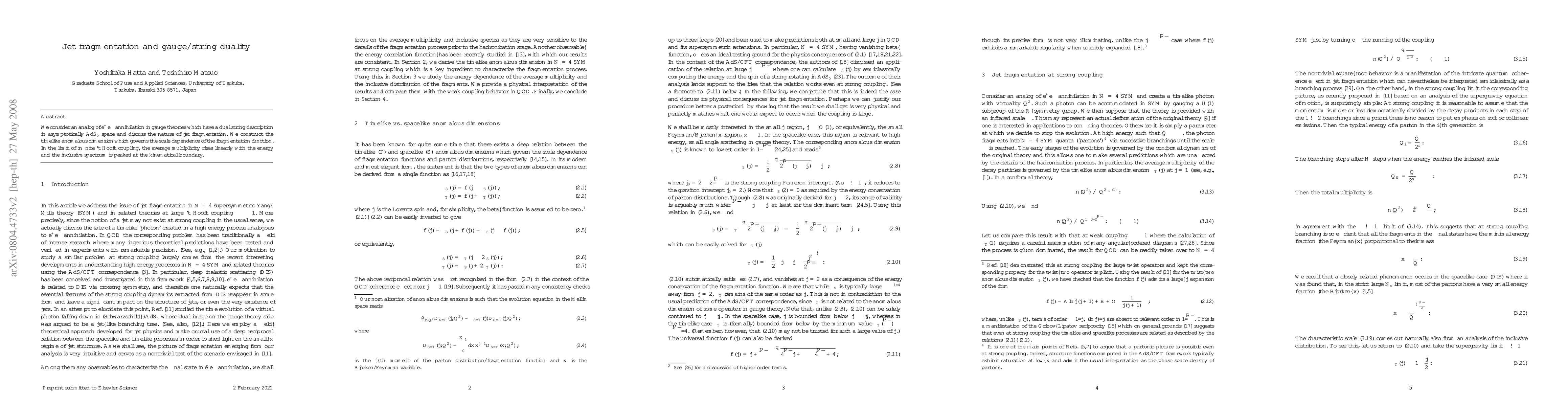 We consider an analog of e^+e^- annihilation in gauge theories which have a dual string description in asymptotically AdS_5 space and discuss the nature of jet fragmentation. We construct the timelike anomalous dimension which governs the scale dependence of the fragmentation function. In the limit of infinite 't Hooft coupling, the average multiplicity rises linearly with the energy and the inclusive spectrum is peaked at the kinematical boundary.