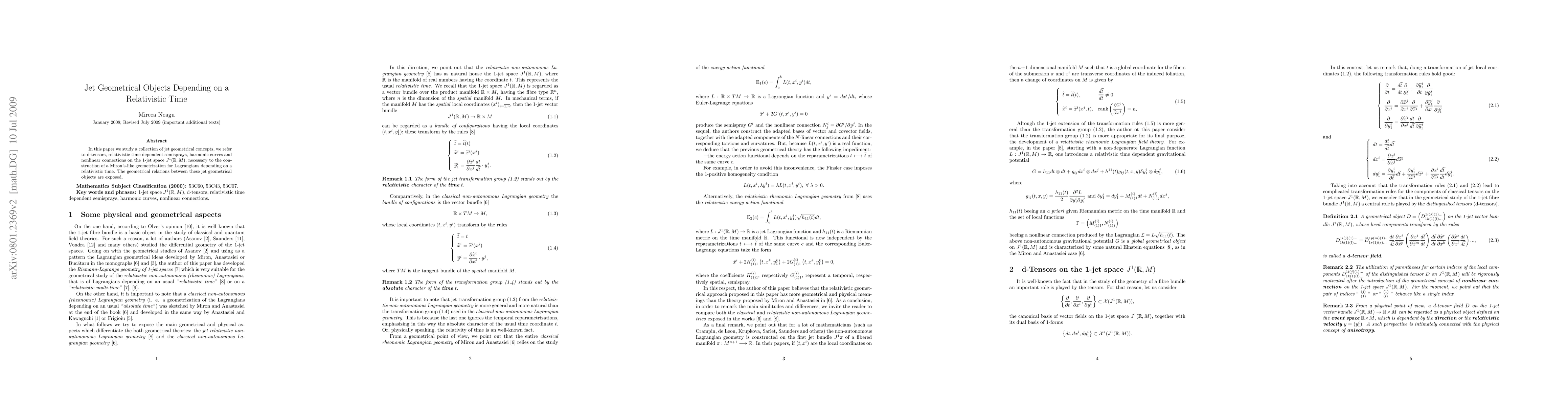This paper explores jet geometrical concepts, including d-tensors, relativistic time dependent semisprays, harmonic curves, and nonlinear connections, to construct a Miron's-like geometrization for Lagrangians that depend on relativistic time, and elucidates the geometrical relationships among these objects.