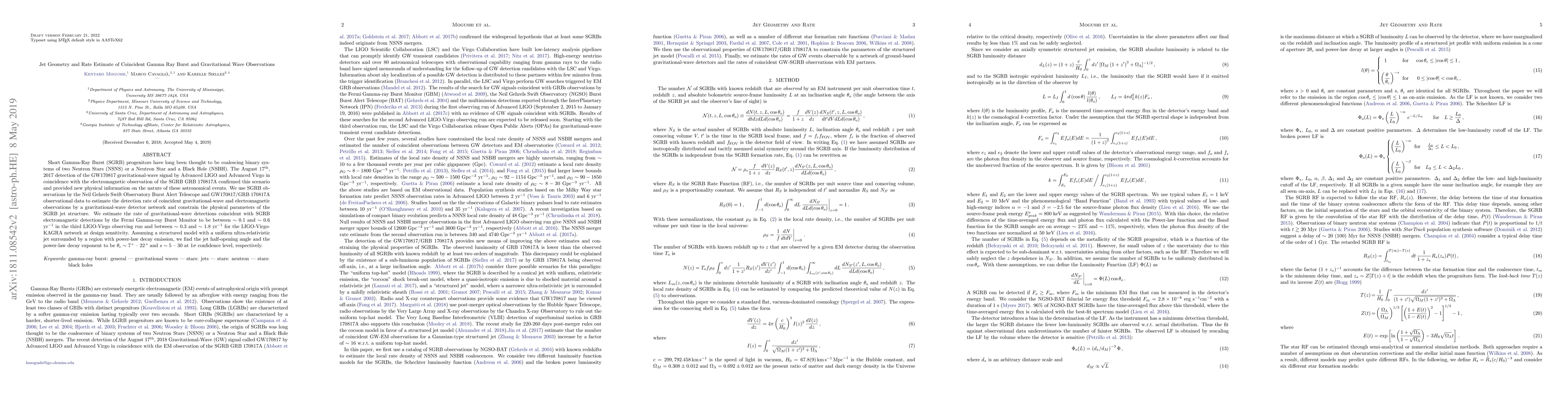 The paper estimates the rate of coincident gravitational-wave and electromagnetic observations from Short Gamma-Ray Bursts (SGRBs), confirming the NSNS/NSBH merger scenario. Using Swift and GW170817/GRB 170817A data, the study predicts 0.1-0.6 coincident events per year for the third LIGO-Virgo run and 0.3-1.8 for the LIGO-Virgo-KAGRA network at design sensitivity. Analyzing a structured jet model, the half-opening angle is found to be 7°--22°, and the power-law decay exponent around 5--30 at 1σ confidence level.