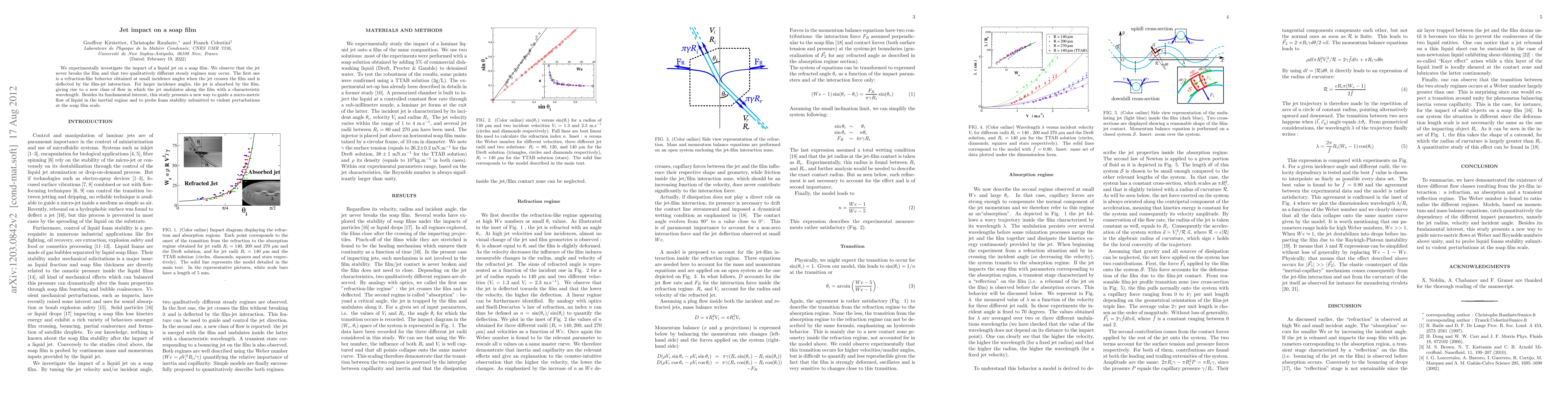 This study experimentally examines the impact of a liquid jet on a soap film, revealing two distinct steady regimes: refraction-like behavior at small angles and undulating absorption at larger angles, offering insights into micro-flow guidance and foam stability.