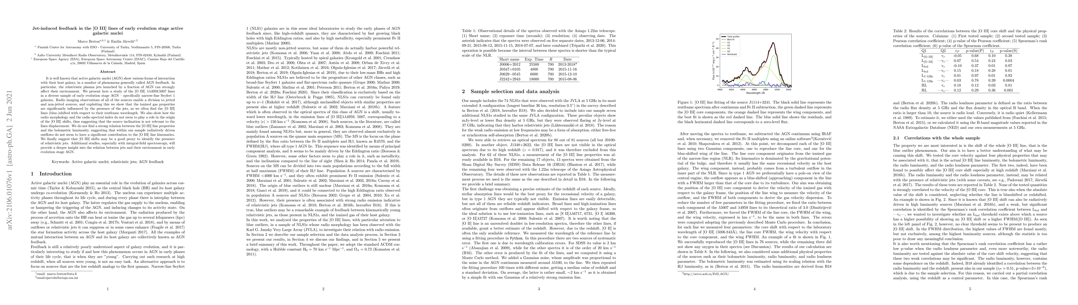 It is well known that active galactic nuclei (AGN) show various forms of interaction with their host galaxy, in a number of phenomena generally called AGN feedback. In particular, the relativistic plasma jets launched by a fraction of AGN can strongly affect their environment. We present here a study of the [O III] $\lambda\lambda$4959,5007 lines in a diverse sample of early evolution stage AGN -- specifically narrow-line Seyfert 1 galaxies. Radio imaging observations of all of the sources enable a division to jetted and non-jetted sources, and exploiting this we show that the ionized gas properties are significantly influenced by the presence of the jets, as we often find the [O III] lines (blue-)shifted with respect to their restframe wavelength. We also show how the radio morphology and the radio spectral index do not seem to play a role in the origin of the [O III] shifts, thus suggesting that the source inclination is not relevant to the lines displacement. We do not find a strong relation between the [O III] line properties and the bolometric luminosity, suggesting that within our sample radiatively driven outflows do not seem to have a significant contribution to the [O III] line kinematics. We finally suggest that [O~ III] shifts may be a good proxy to identify the presence of relativistic jets. Additional studies, especially with integral-field spectroscopy, will provide a deeper insight into the relation between jets and their environment in early evolution stage AGN.