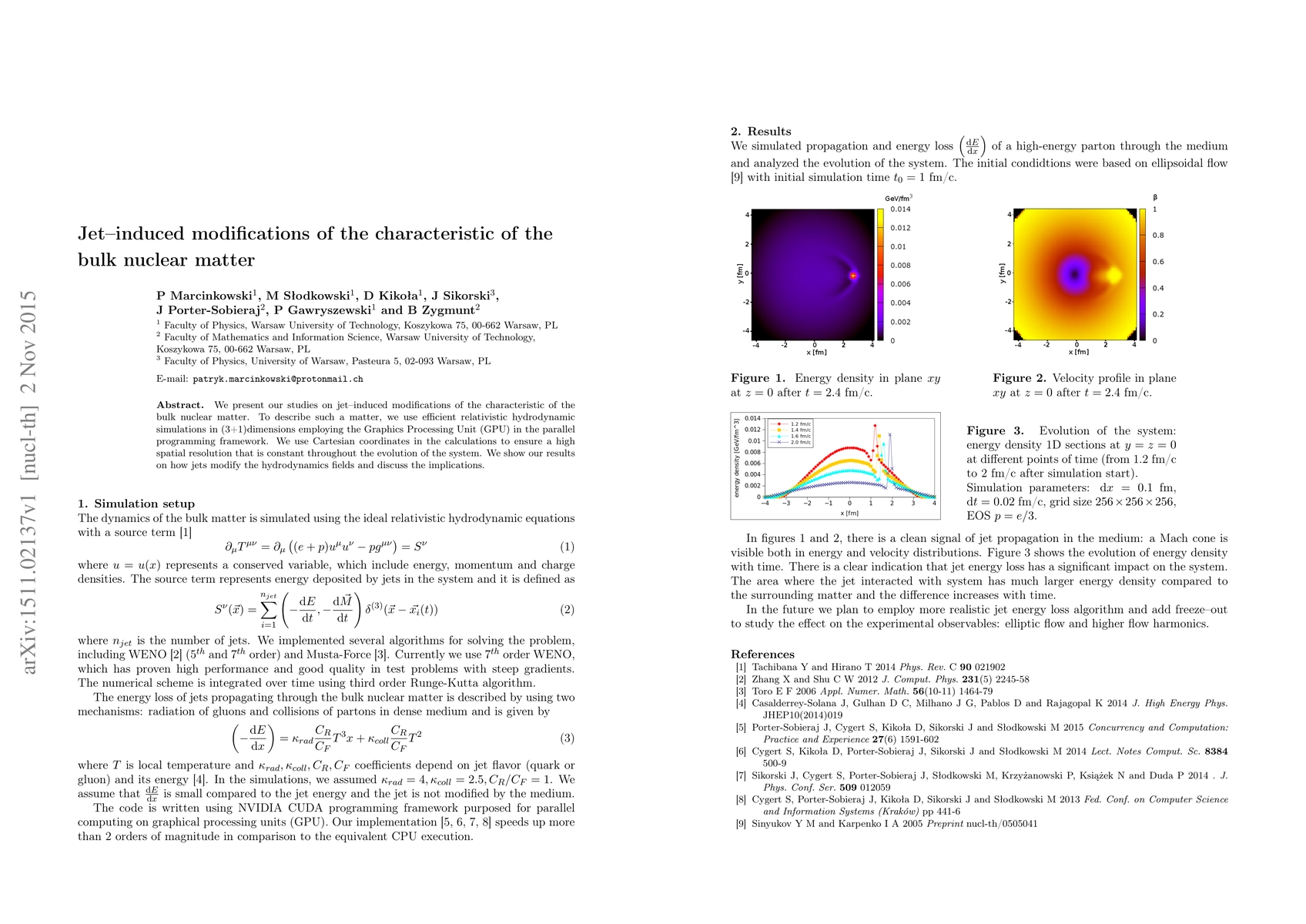 The main technical contribution is the use of GPU-accelerated relativistic hydrodynamic simulations with high spatial resolution for studying jet-induced modifications in bulk nuclear matter.