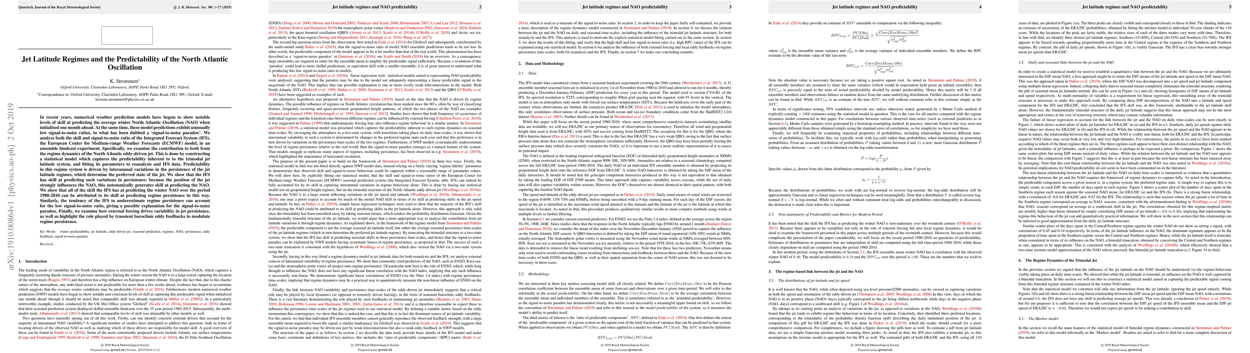 This paper investigates the predictability of the North Atlantic Oscillation (NAO) using the European Center for Medium-range Weather Forecasts (ECMWF) model, attributing the model's skill to its ability to predict variations in jet latitude regimes. It also explains the low signal-to-noise ratio in model predictions by the model's tendency to underestimate regime persistence.
