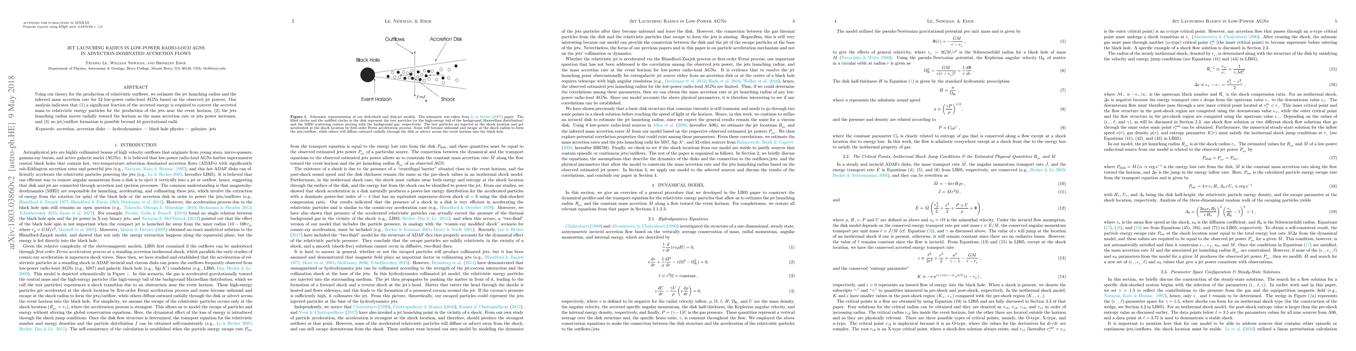 Using our theory for the production of relativistic outflows, we estimate the jet launching radius and the inferred mass accretion rate for 52 low-power radio-loud AGNs based on the observed jet powers. Our analysis indicates that (1) a significant fraction of the accreted energy is required to convert the accreted mass to relativistic energy particles for the production of the jets near the event horizon, (2) the jets launching radius moves radially toward the horizon as the mass accretion rate or jets power increases, and (3) no jet/outflow formation is possible beyond 44 gravitational radii.