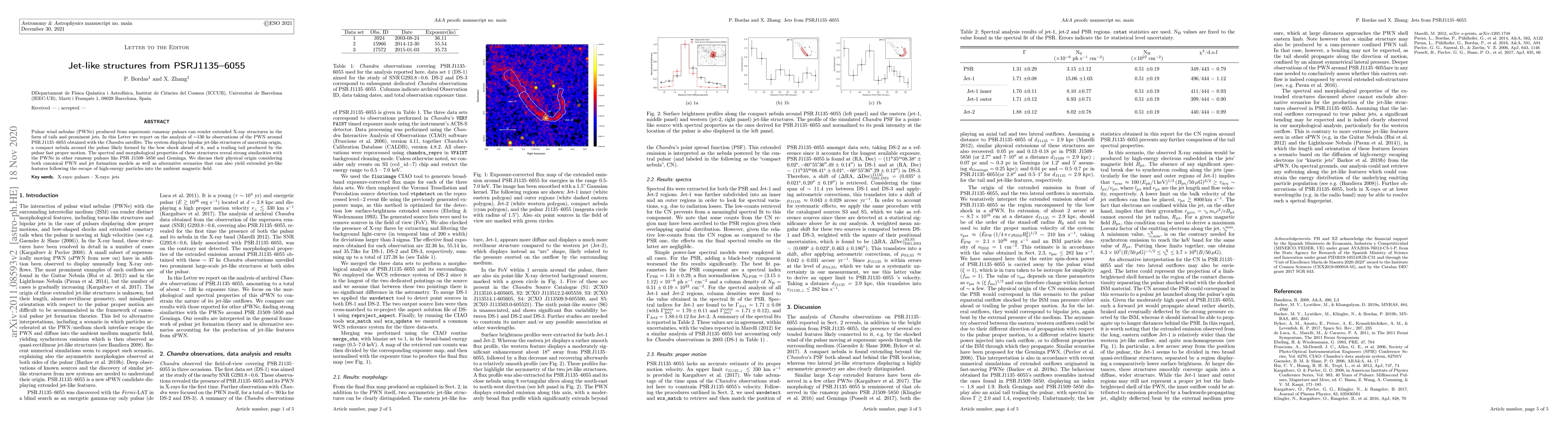 Pulsar wind nebulae (PWNe) produced from supersonic runaway pulsars can render extended X-ray structures in the form of tails and prominent jets. In this Letter we report on the analysis of $\sim$130 ks observations of the PWN around PSR$\,$J1135-6055 obtained with the Chandra satellite. The system displays bipolar jet-like structures of uncertain origin, a compact nebula around the pulsar likely formed by the bow shock ahead of it, and a trailing tail produced by the pulsar fast proper motion. The spectral and morphological properties of these structures reveal strong similarities with the PWNe in other runaway pulsars like PSR J1509-5850 and Geminga. We discuss their physical origin considering both canonical PWN and jet formation models as well as alternative scenarios that can also yield extended jet-like features following the escape of high-energy particles into the ambient magnetic field.