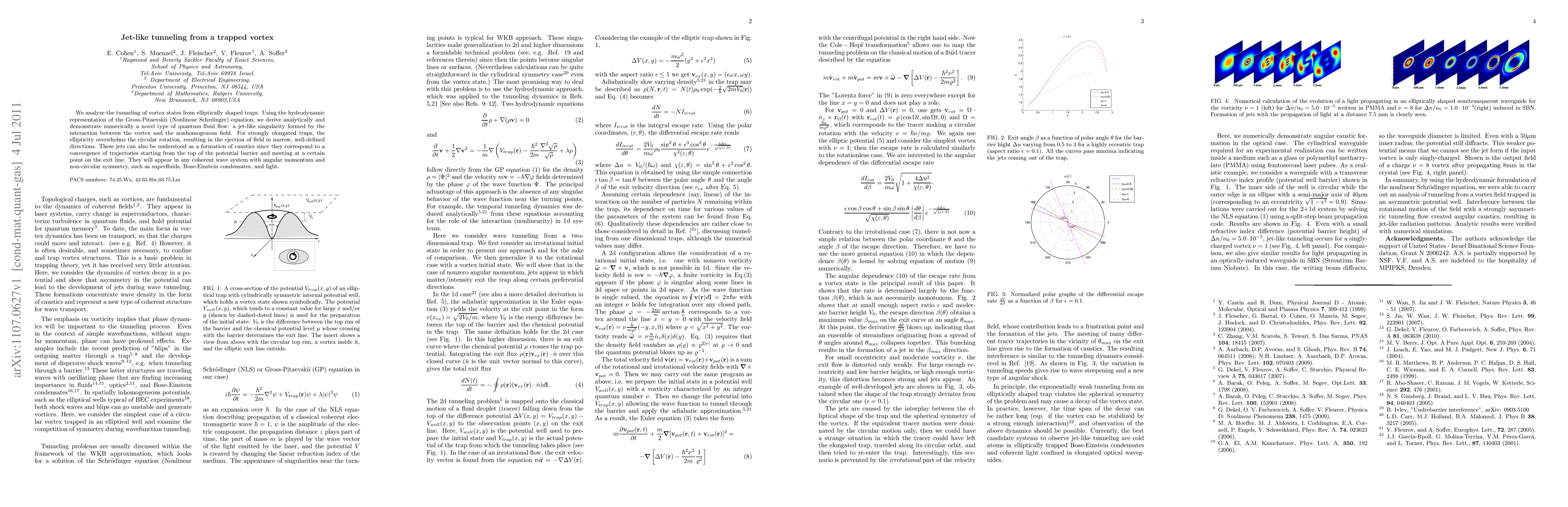 We analyze the tunneling of vortex states from elliptically shaped traps. Using the hydrodynamic representation of the Gross-Pitaevskii (Nonlinear Schr\"odinger) equation, we derive analytically and demonstrate numerically a novel type of quantum fluid flow: a jet-like singularity formed by the interaction between the vortex and the nonhomogenous field. For strongly elongated traps, the ellipticity overwhelms the circular rotation, resulting in the ejection of field in narrow, well-defined directions. These jets can also be understood as a formation of caustics since they correspond to a convergence of trajectories starting from the top of the potential barrier and meeting at a certain point on the exit line. They will appear in any coherent wave system with angular momentum and non-circular symmetry, such as superfluids, Bose-Einstein condensates, and light.