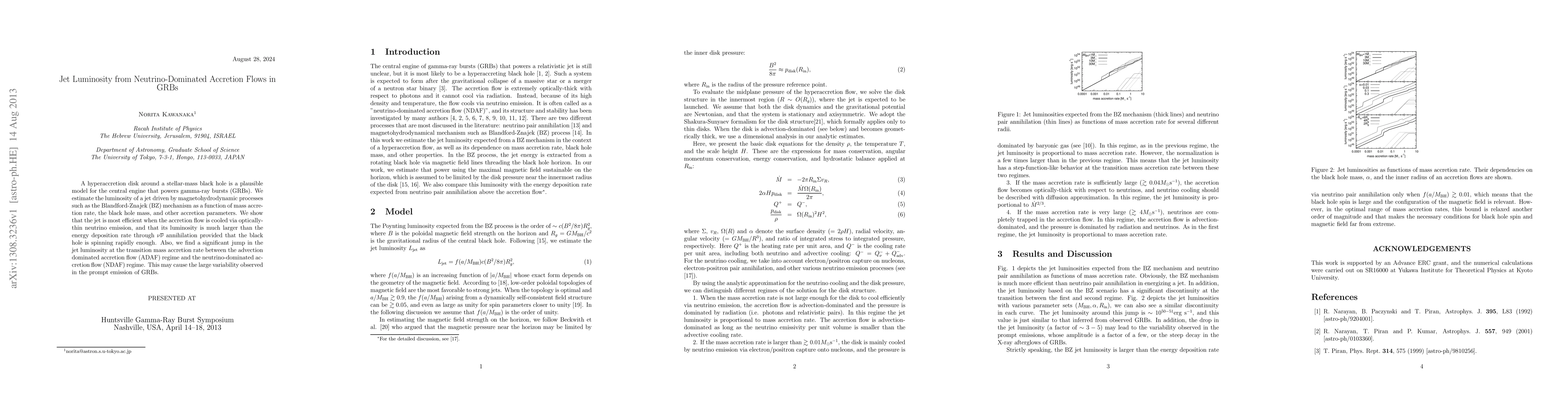 This study models jet luminosity in gamma-ray bursts (GRBs) driven by magnetohydrodynamic processes in hyperaccretion disks around stellar-mass black holes. It finds that neutrino-dominated accretion flows (NDAF) significantly boost jet luminosity, which surpasses energy from neutrino annihilation with rapidly spinning black holes. A notable luminosity increase occurs at the transition from advection-dominated accretion flows (ADAF) to NDAF, potentially explaining GRB prompt emission variability.