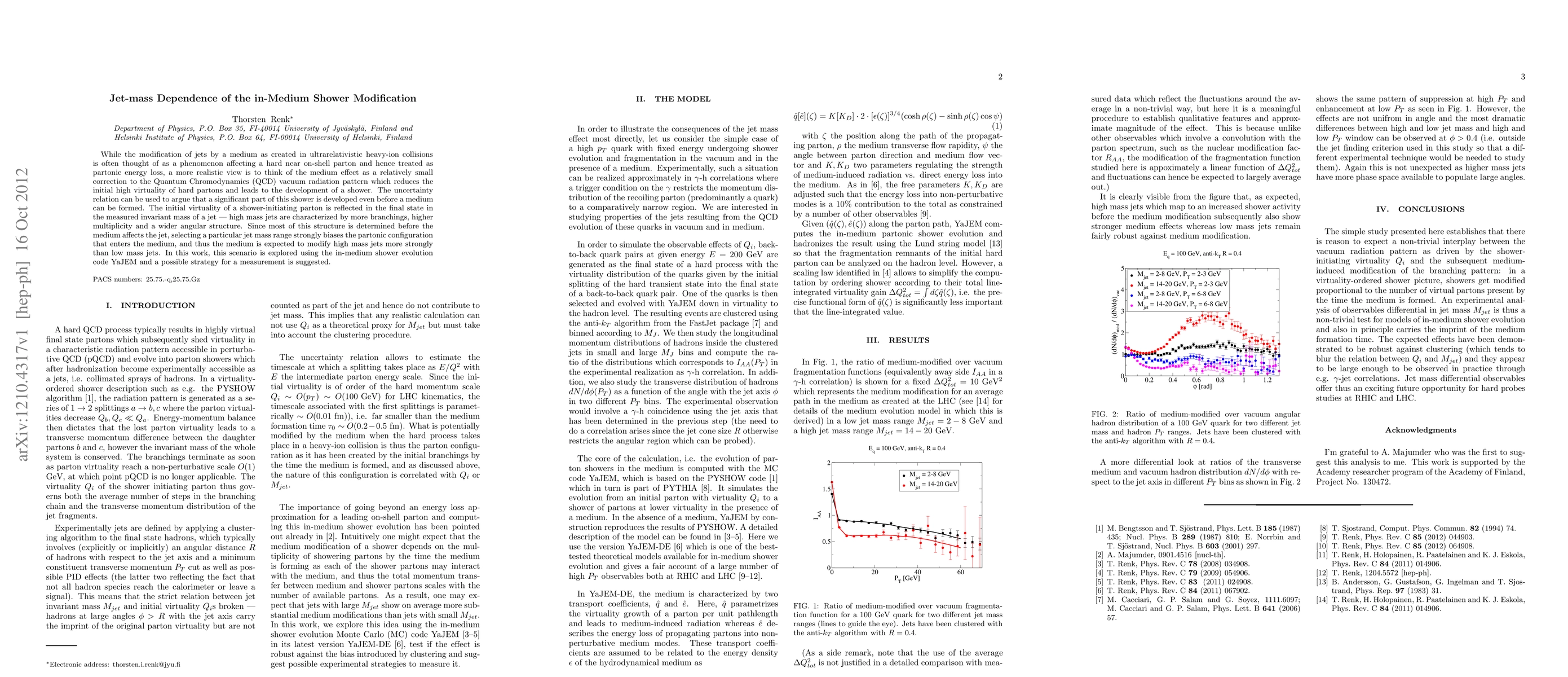 This paper investigates how the mass of jets influences their modification by the medium in ultrarelativistic heavy-ion collisions, suggesting that high-mass jets undergo more significant changes due to partonic energy loss effects. The study employs the YaJEM code to explore this jet-mass dependence and proposes a strategy for experimental measurement.