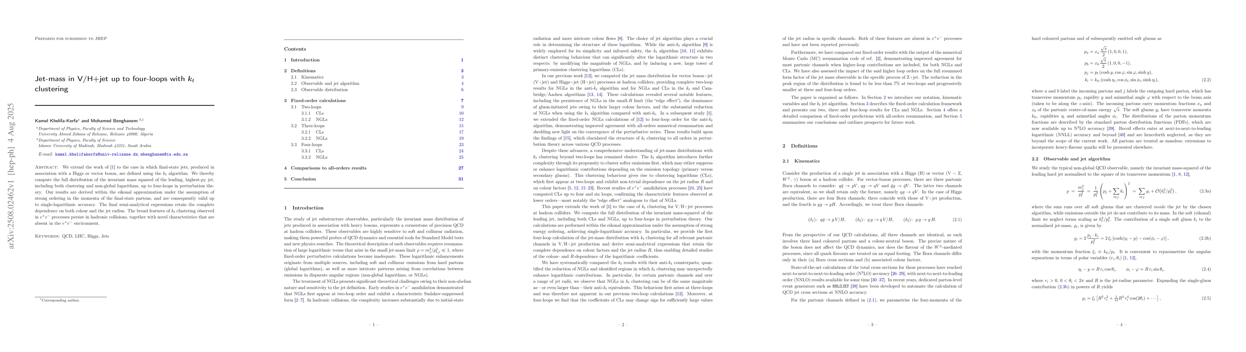 The research extends previous work on jet-mass distributions in V/H+jet processes to the kt algorithm, providing the first comprehensive calculation of both clustering logarithms (CLs) and non-global logarithms (NGLs) up to four-loops in perturbative QCD. Calculations are performed within the eikonal approximation under strong energy ordering, ensuring single-logarithmic accuracy.