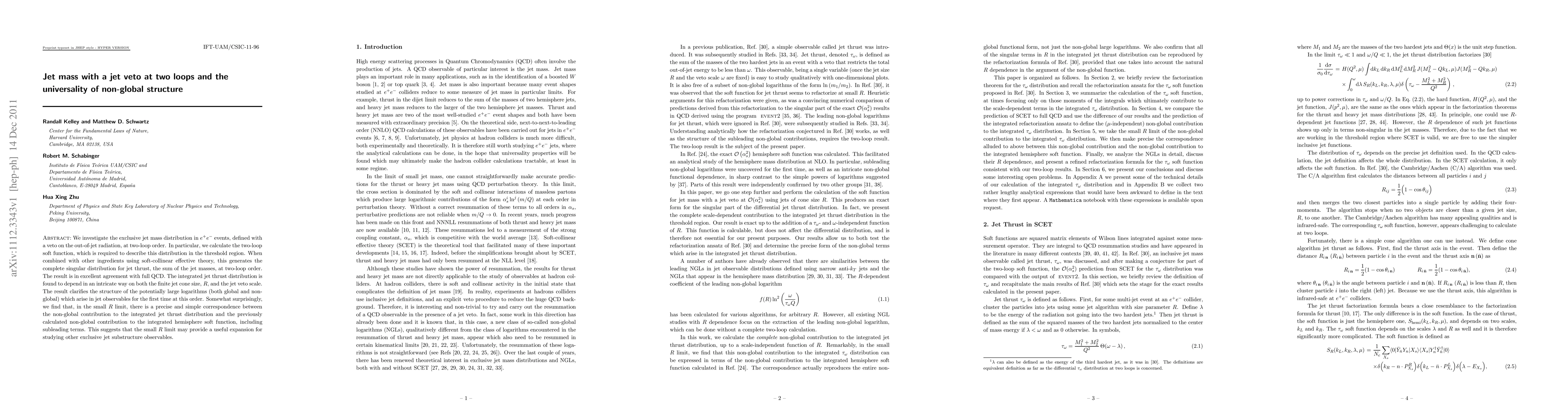 This paper investigates the two-loop order exclusive jet mass distribution in e+e- events with a jet veto, calculating the two-loop soft function and demonstrating excellent agreement with full QCD. The study reveals a precise correspondence between non-global contributions to the jet thrust distribution and the hemisphere soft function, suggesting a useful expansion for studying other jet substructure observables.