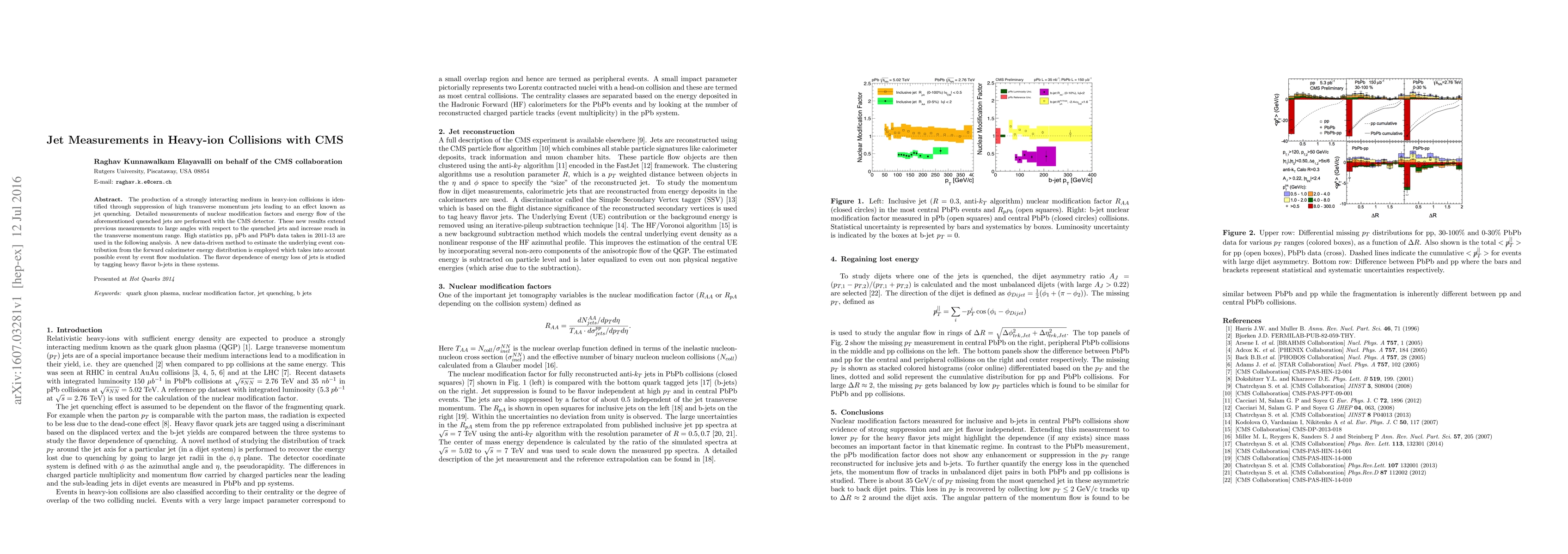 The production of a strongly interacting medium in heavy-ion collisions is identified through suppression of high transverse momentum jets leading to an effect known as jet quenching. Detailed measurements of nuclear modification factors and energy flow of the aforementioned quenched jets are performed with the CMS detector. These new results extend previous measurements to large angles with respect to the quenched jets and increase reach in the transverse momentum range. High statistics pp, pPb and PbPb data taken in 2011-13 are used in the following analysis. A new data-driven method to estimate the underlying event contribution from the forward calorimeter energy distribution is employed which takes into account possible event by event flow modulation. The flavor dependence of energy loss of jets is studied by tagging heavy flavor b-jets in these systems.