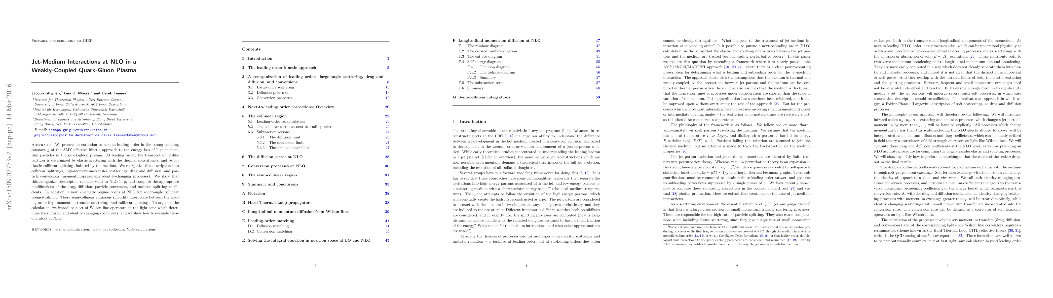We present an extension to next-to-leading order in the strong coupling constant $g$ of the AMY effective kinetic approach to the energy loss of high momentum particles in the quark-gluon plasma. At leading order, the transport of jet-like particles is determined by elastic scattering with the thermal constituents, and by inelastic collinear splittings induced by the medium. We reorganize this description into collinear splittings, high-momentum-transfer scatterings, drag and diffusion, and particle conversions (momentum-preserving identity-changing processes). We show that this reorganized description remains valid to NLO in $g$, and compute the appropriate modifications of the drag, diffusion, particle conversion, and inelastic splitting coefficients. In addition, a new kinematic regime opens at NLO for wider-angle collinear bremsstrahlung. These semi-collinear emissions smoothly interpolate between the leading order high-momentum-transfer scatterings and collinear splittings. To organize the calculation, we introduce a set of Wilson line operators on the light-cone which determine the diffusion and identity changing coefficients, and we show how to evaluate these operators at NLO.