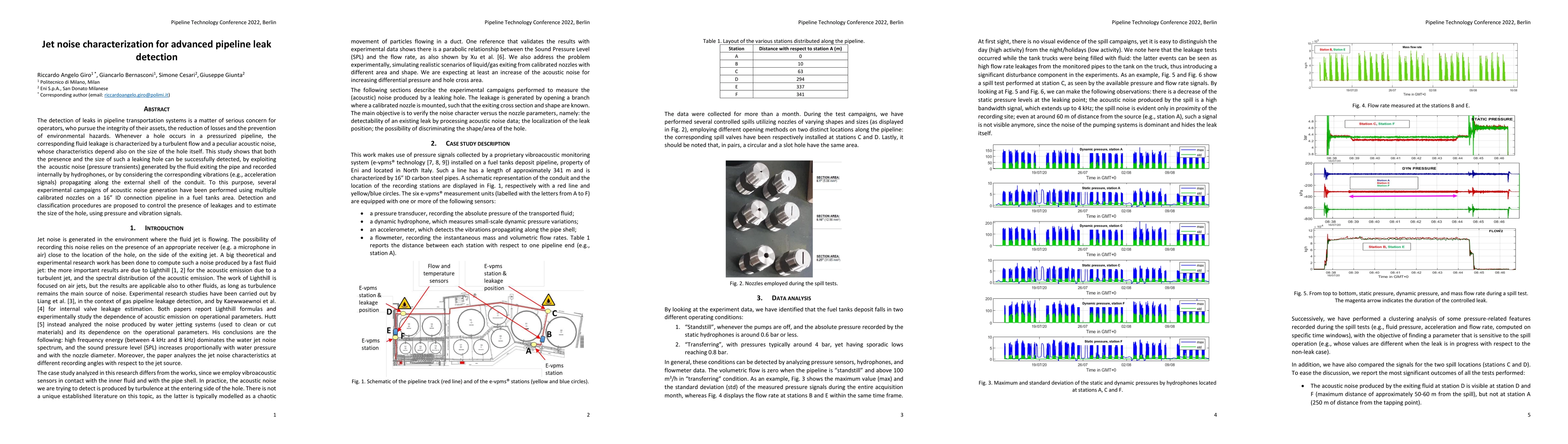 The approach uses pressure transients and vibrations along the pipe's external shell to identify leak presence and size, with promising results from experimental campaigns on a 16 ID connection pipeline.