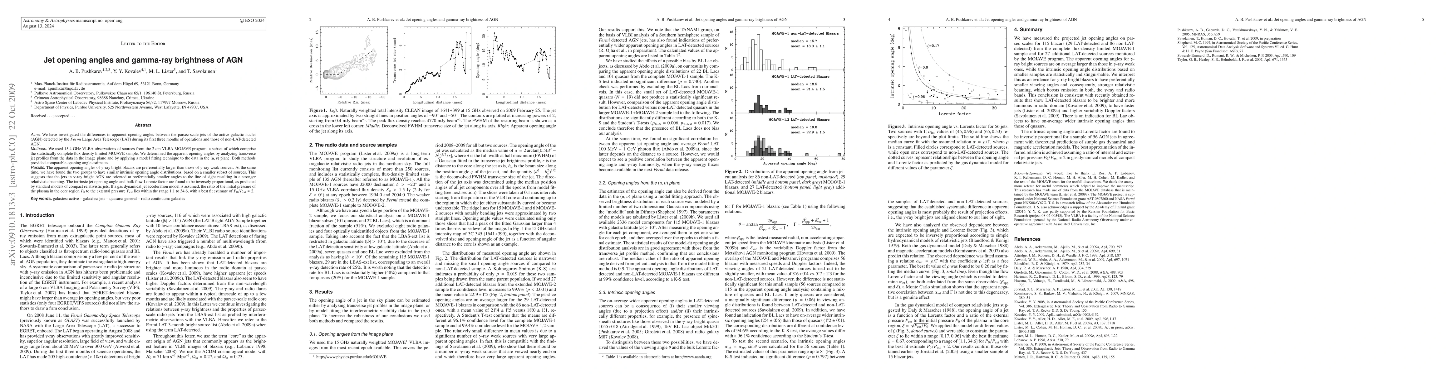 This study investigates the apparent opening angles of AGN jets detected by the Fermi LAT, finding that gamma-ray bright blazars have larger apparent opening angles compared to gamma-ray weak sources, suggesting stronger relativistic beaming. The intrinsic opening angles and jet Lorentz factors are inversely proportional, consistent with standard jet models.