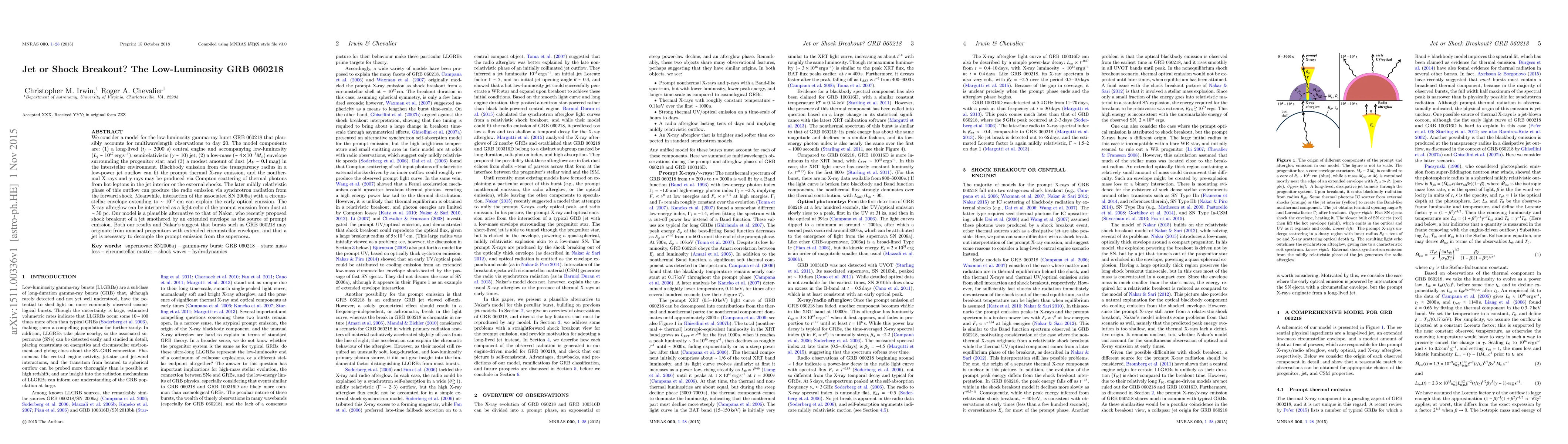 This paper proposes a model for the low-luminosity GRB 060218 involving a long-lived, low-power jet and an extended circumstellar envelope, explaining the multiwavelength observations through jet breakout and synchrotron radiation. It contrasts with an alternative model suggesting shock breakout, suggesting both scenarios involve unusual progenitors with extended envelopes.