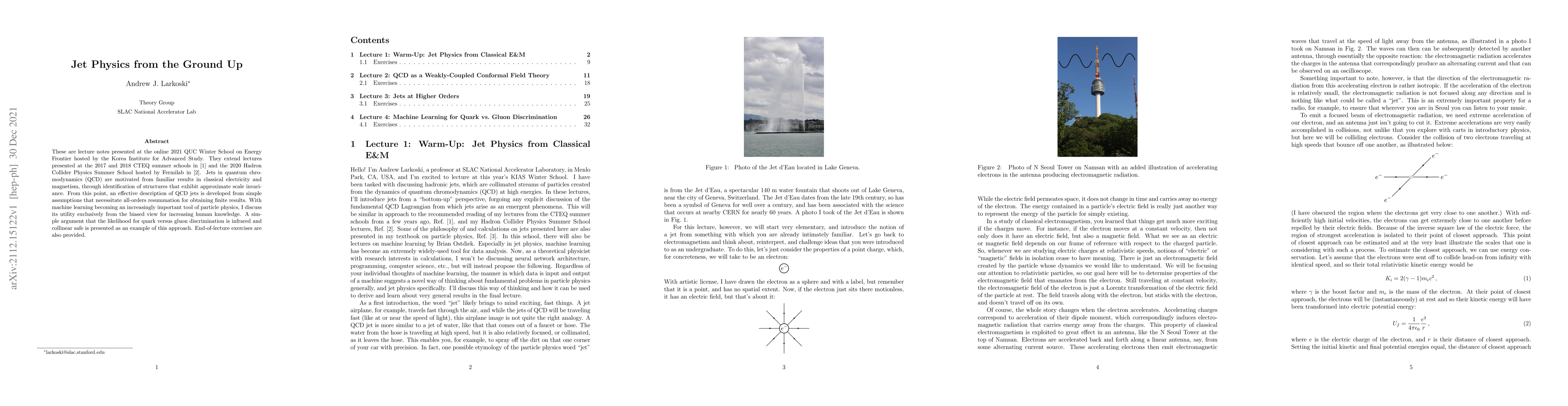 These are lecture notes presented at the online 2021 QUC Winter School on Energy Frontier hosted by the Korea Institute for Advanced Study. They extend lectures presented at the 2017 and 2018 CTEQ summer schools and the 2020 Hadron Collider Physics Summer School hosted by Fermilab. Jets in quantum chromodynamics (QCD) are motivated from familiar results in classical electricity and magnetism, through identification of structures that exhibit approximate scale invariance. From this point, an effective description of QCD jets is developed from simple assumptions that necessitate all-orders resummation for obtaining finite results. With machine learning becoming an increasingly important tool of particle physics, I discuss its utility exclusively from the biased view for increasing human knowledge. A simple argument that the likelihood for quark versus gluon discrimination is infrared and collinear safe is presented as an example of this approach. End-of-lecture exercises are also provided.