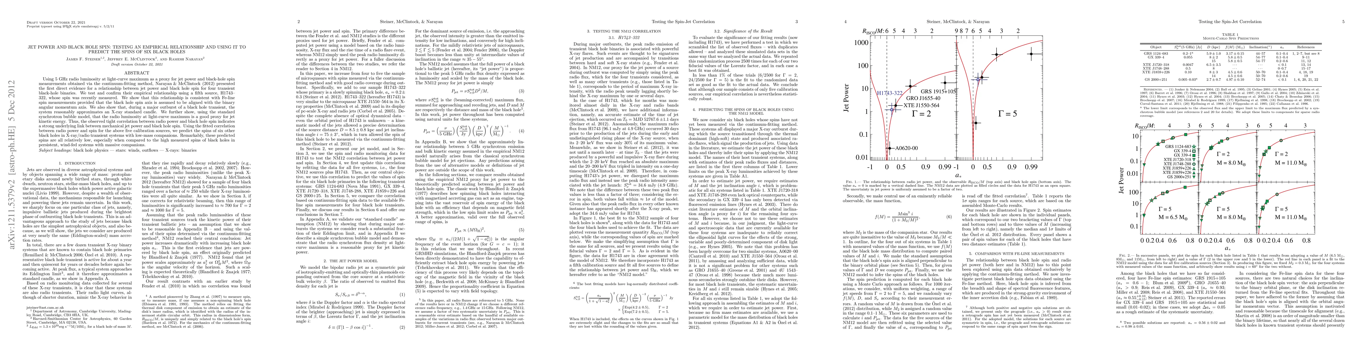 Using 5 GHz radio luminosity at light-curve maximum as a proxy for jet power and black-hole spin measurements obtained via the continuum-fitting method, Narayan & McClintock (2012) presented the first direct evidence for a relationship between jet power and black hole spin for four transient black-hole binaries. We test and confirm their empirical relationship using a fifth source, H1743-322, whose spin was recently measured. We show that this relationship is consistent with Fe-line spin measurements provided that the black hole spin axis is assumed to be aligned with the binary angular momentum axis. We also show that, during a major outburst of a black hole transient, the system reasonably approximates an X-ray standard candle. We further show, using the standard synchrotron bubble model, that the radio luminosity at light-curve maximum is a good proxy for jet kinetic energy. Thus, the observed tight correlation between radio power and black hole spin indicates a strong underlying link between mechanical jet power and black hole spin. Using the fitted correlation between radio power and spin for the above five calibration sources, we predict the spins of six other black holes in X-ray/radio transient systems with low-mass companions. Remarkably, these predicted spins are all relatively low, especially when compared to the high measured spins of black holes in persistent, wind-fed systems with massive companions.